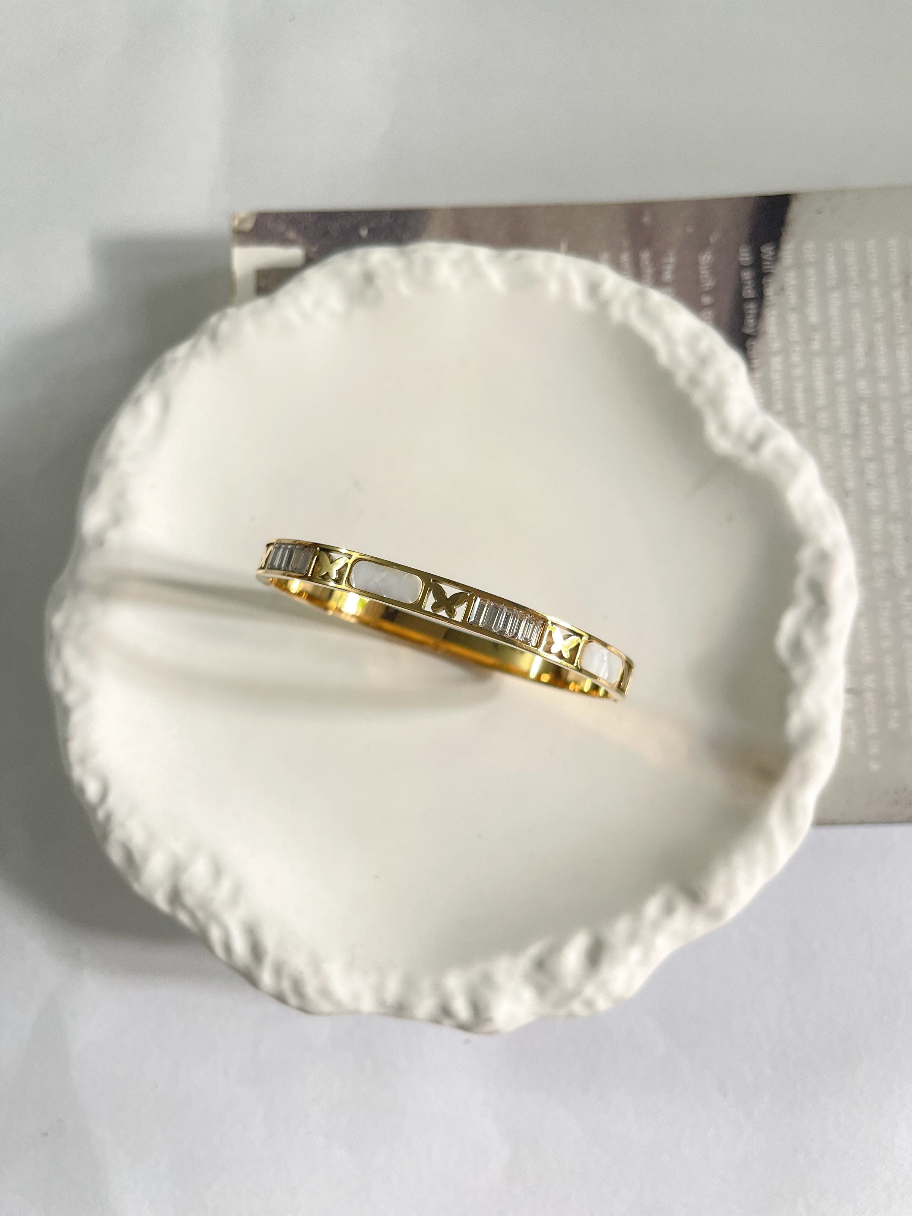 Grace meets gold in Aurelian Wings, a radiant golden cuff adorned with white stones and delicately etched butterflies.