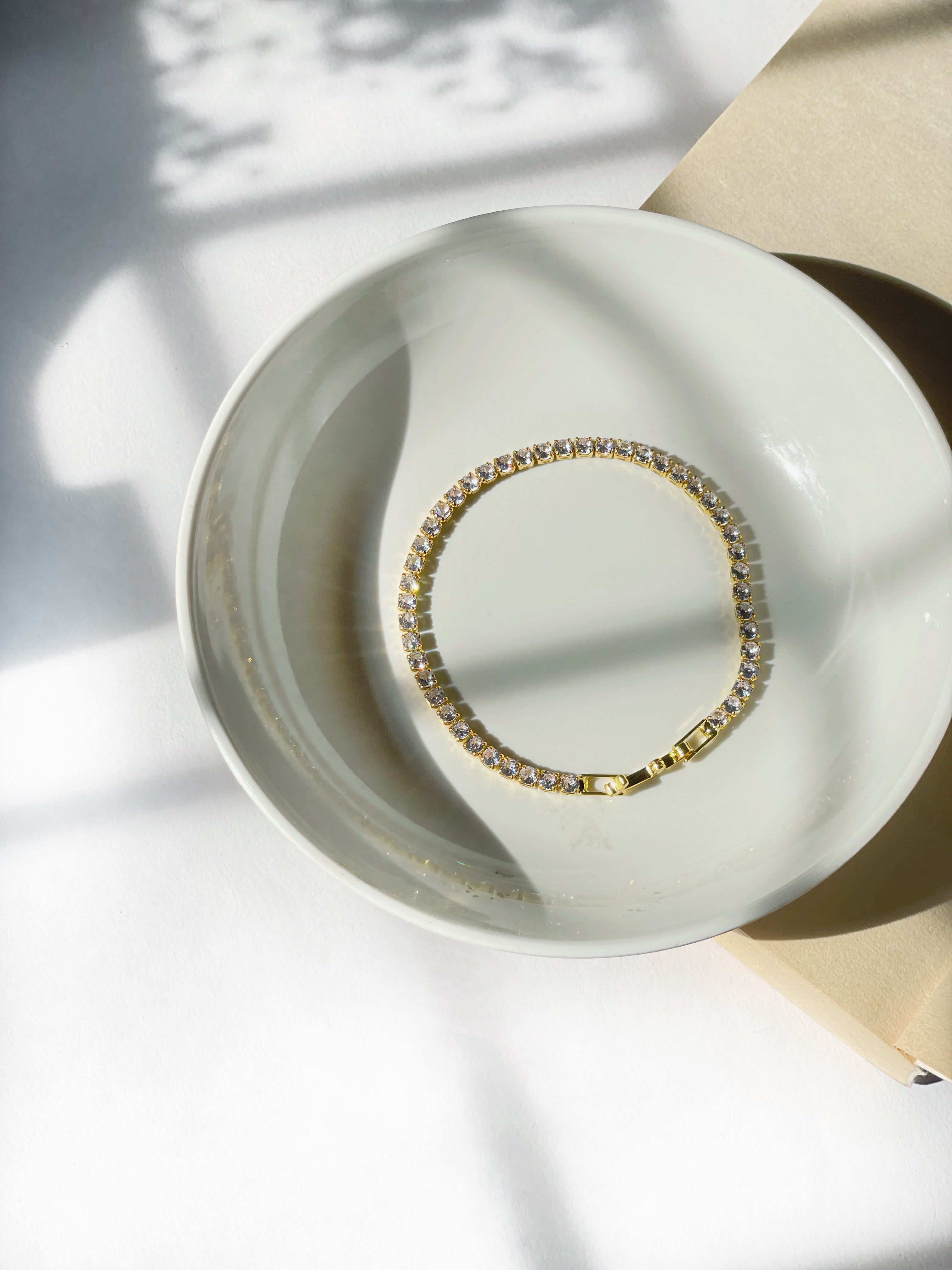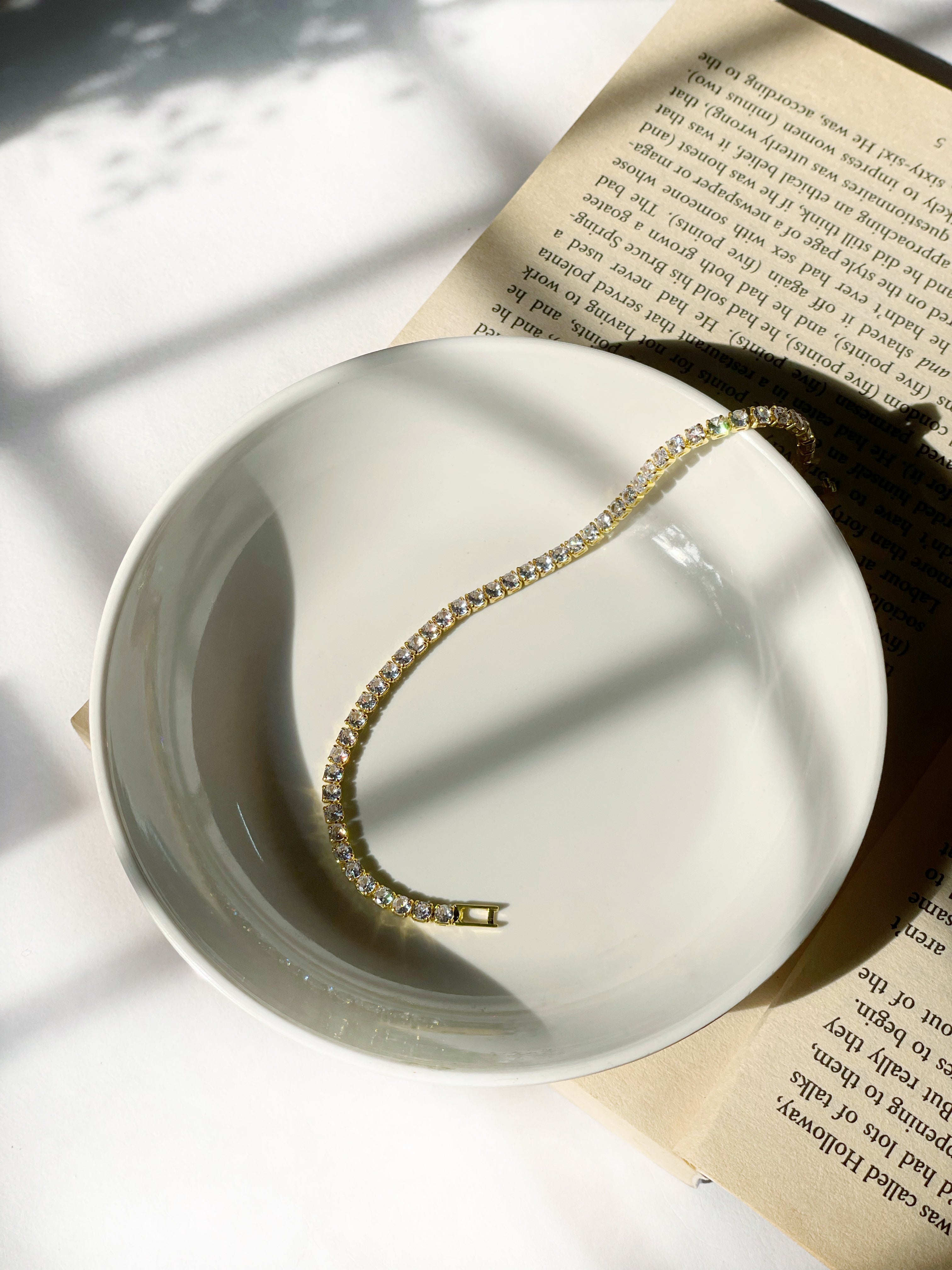 Chains of Cersei drapes the wrist in gold and gleam, its clear-cut stones flickering like secrets behind a queen’s eyes. Each link is a silent testament to power wrapped in beauty – regal, radiant, and unmistakably commanding.