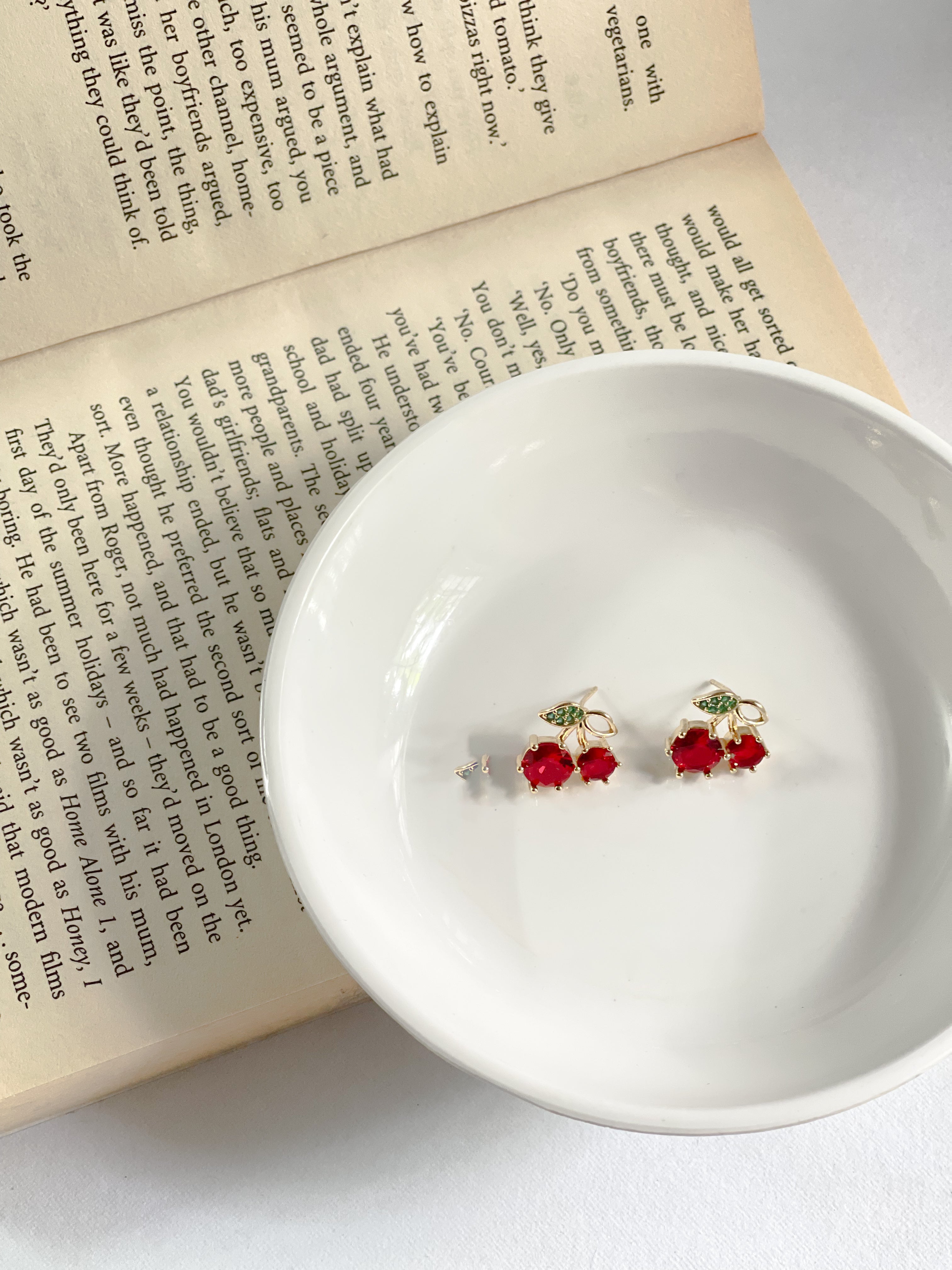 Two cute cherries dangling from a gilded branch, Cherry Whim evokes the tenderness of new love and the delight of small joys.