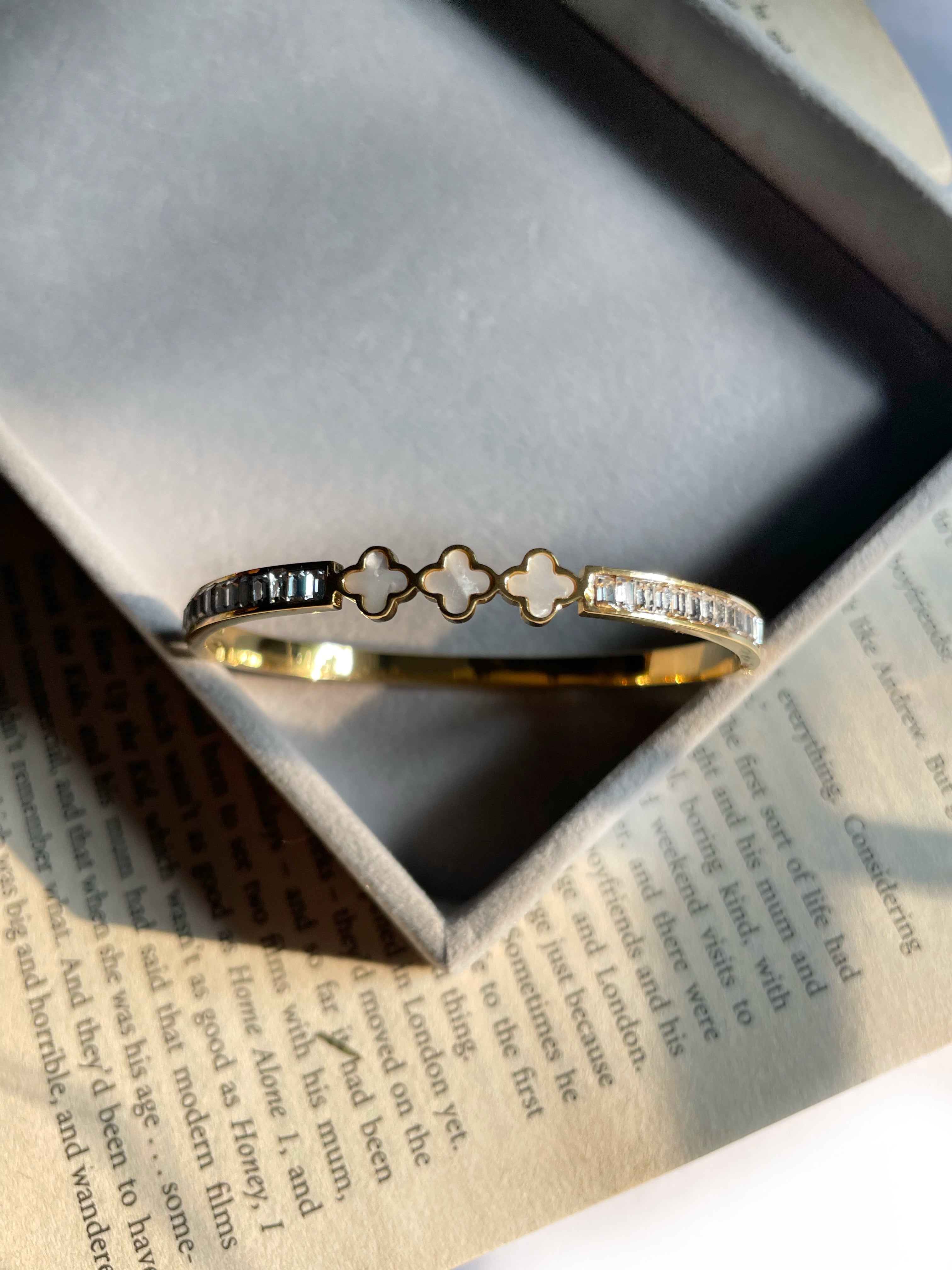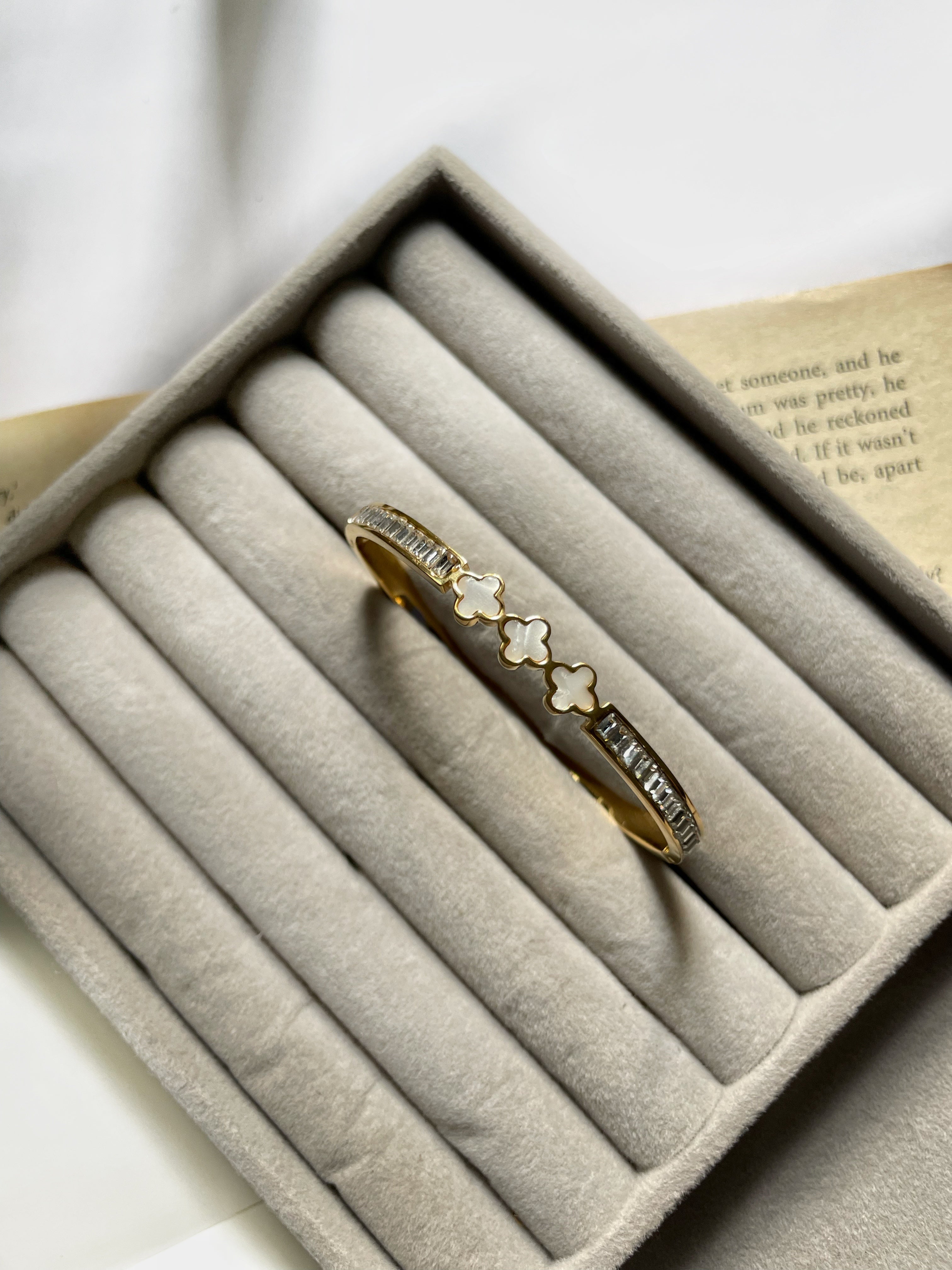 Elevate your style with our Clover Crown cuff, featuring three elegant white clover centerpieces on a golden band adorned with a textured, stony layer. This unique design combines natural charm with luxurious sophistication.