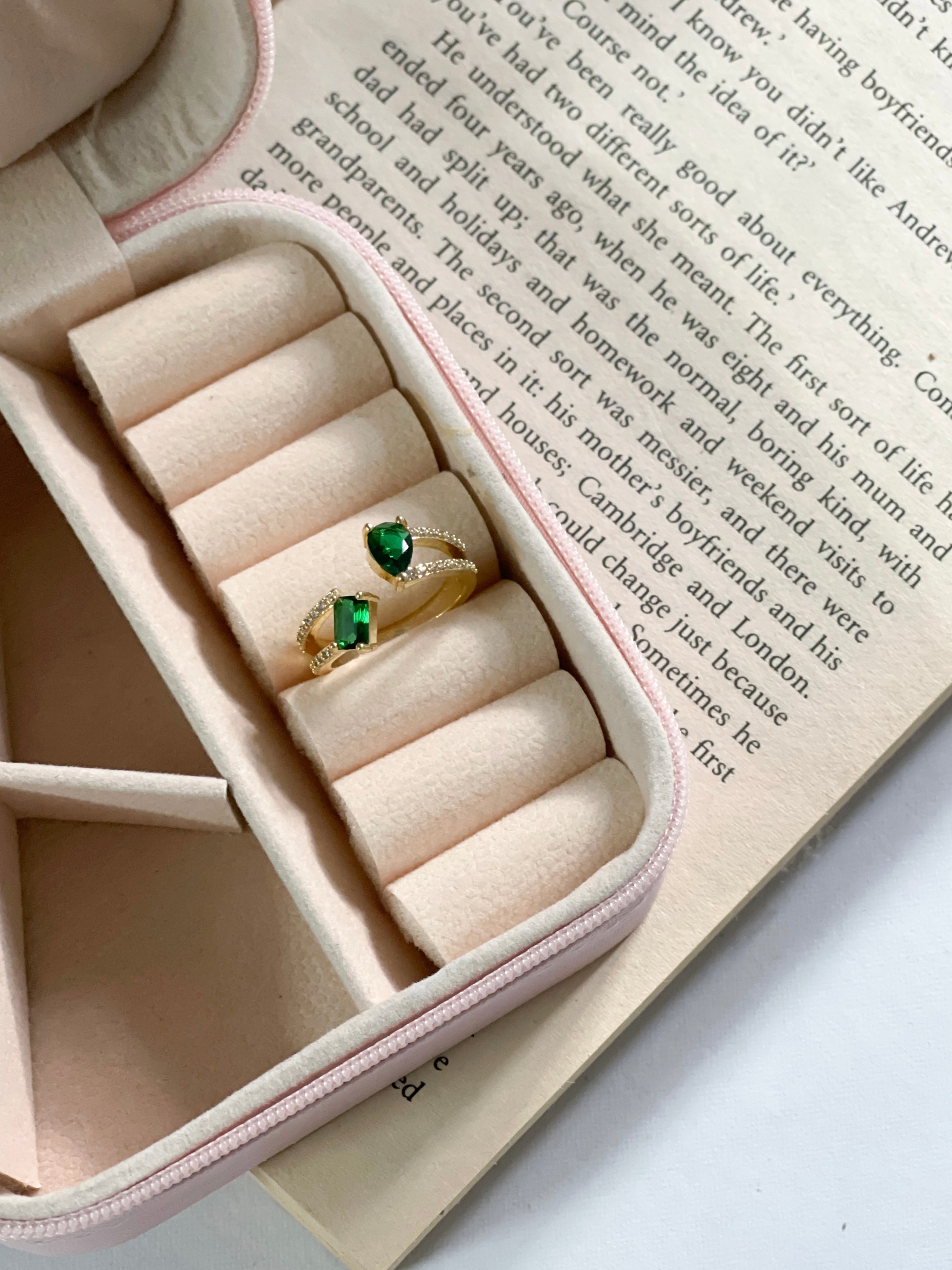 Twin bands of gold shimmer with rows of delicate stones, meeting at two radiant emeralds that mirror one another like reflections of a shared soul.