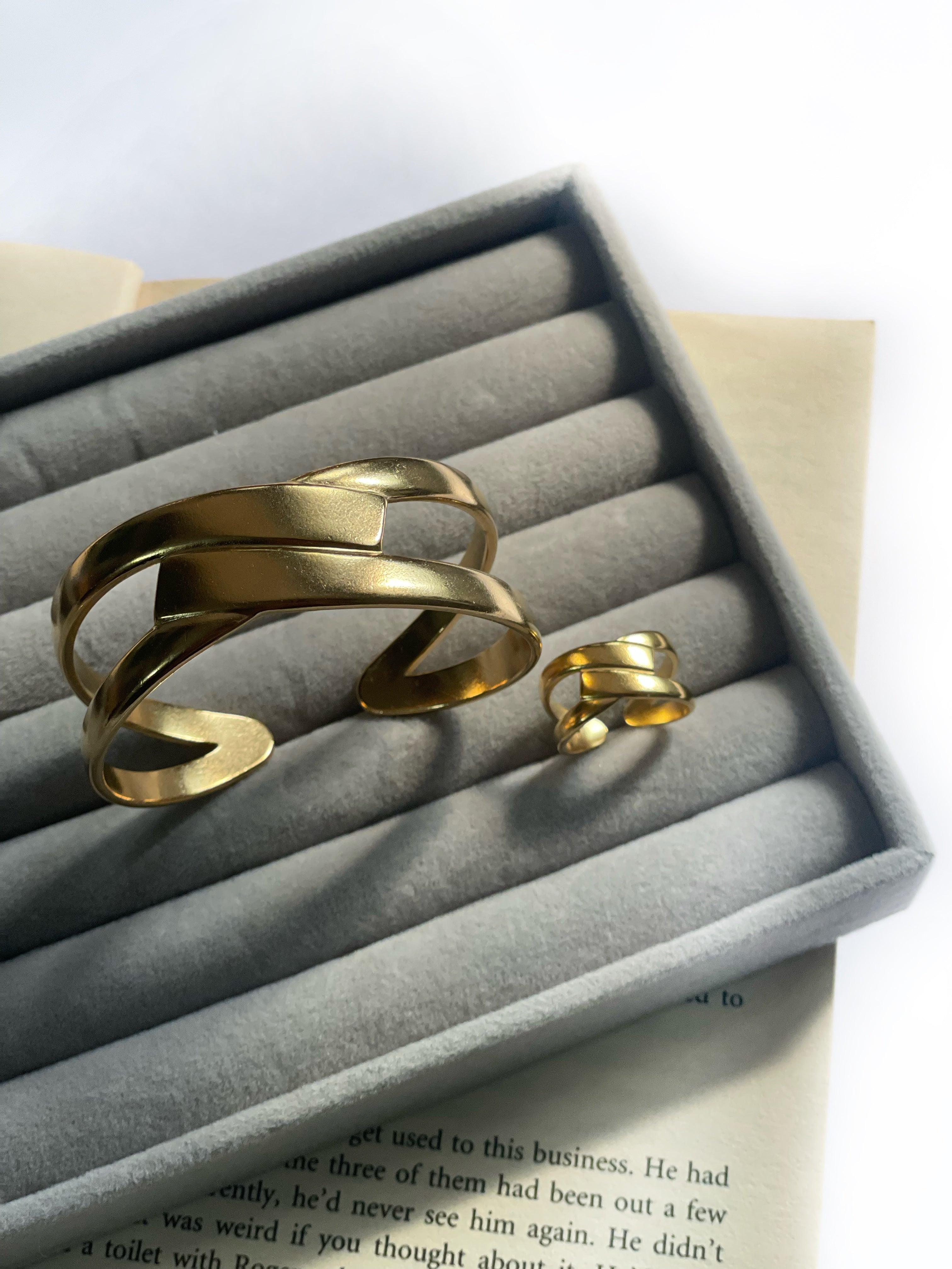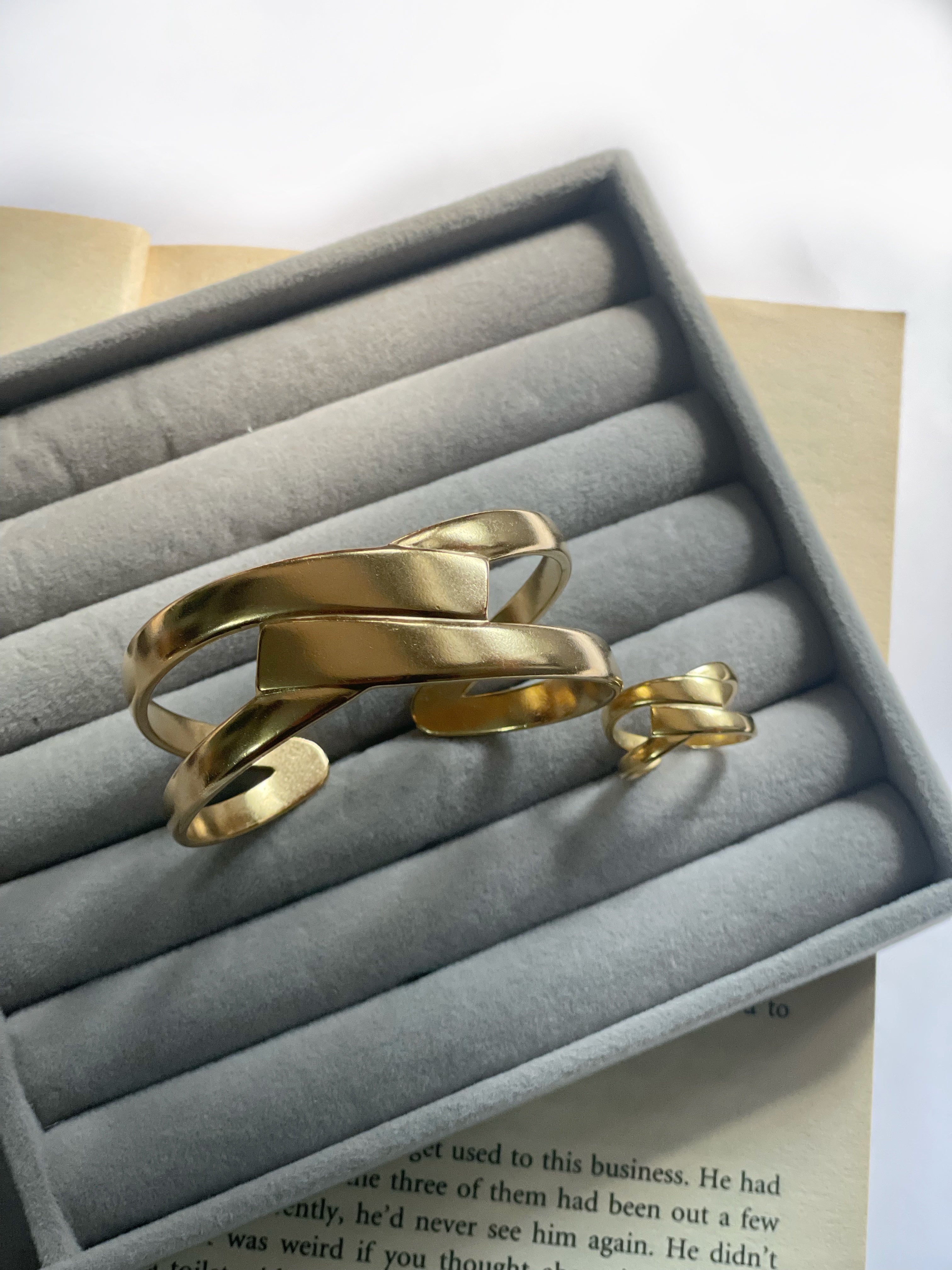 Sculpted in matte gold, Dune Mirage captures the fluid grace of desert sands. Bold yet minimal, this cuff and ring set is made for effortless elegance with a touch of mystique.