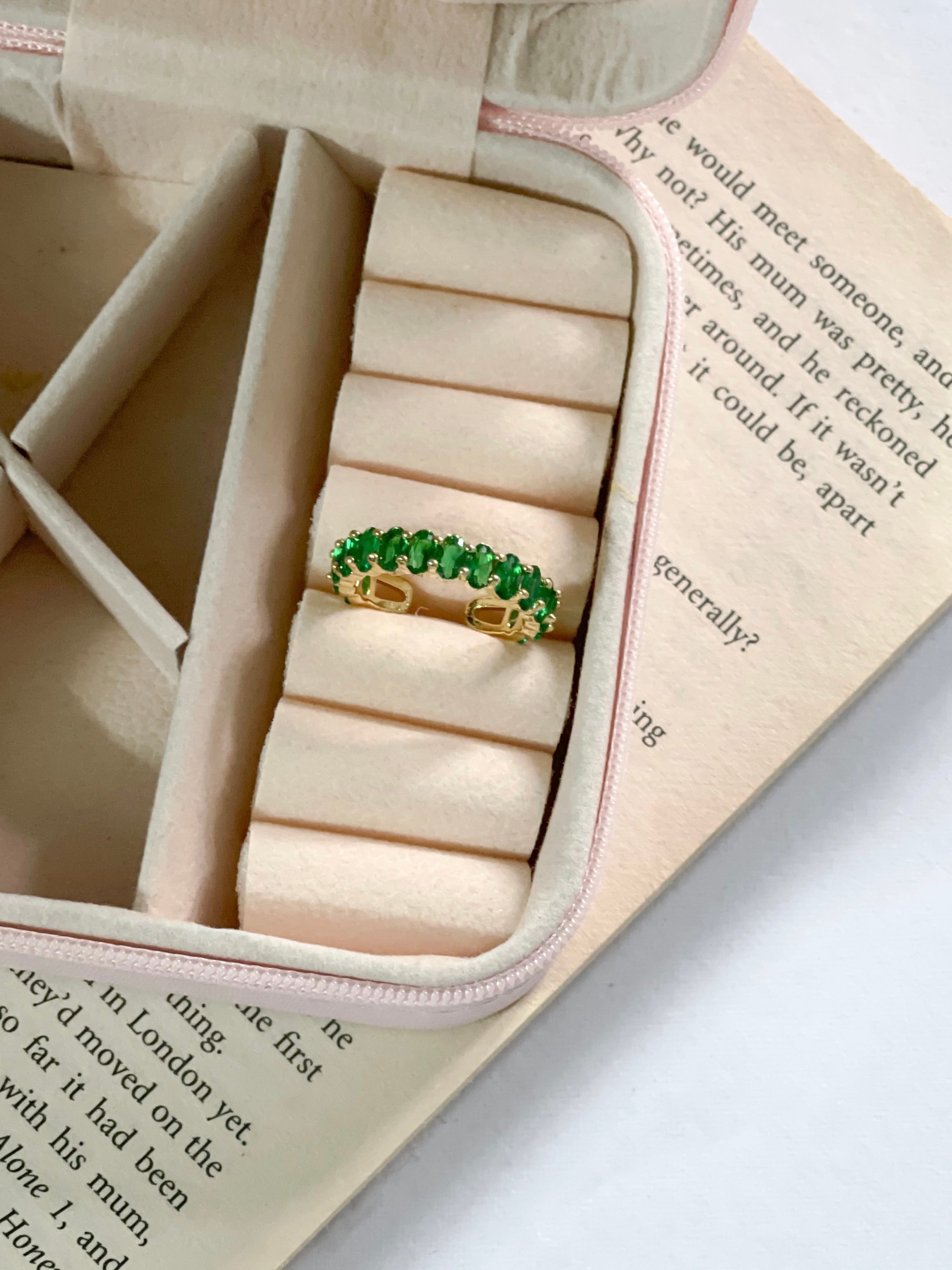 A graceful row of vertical emerald stones crowns a slender golden band, forming a design both serene and radiant.