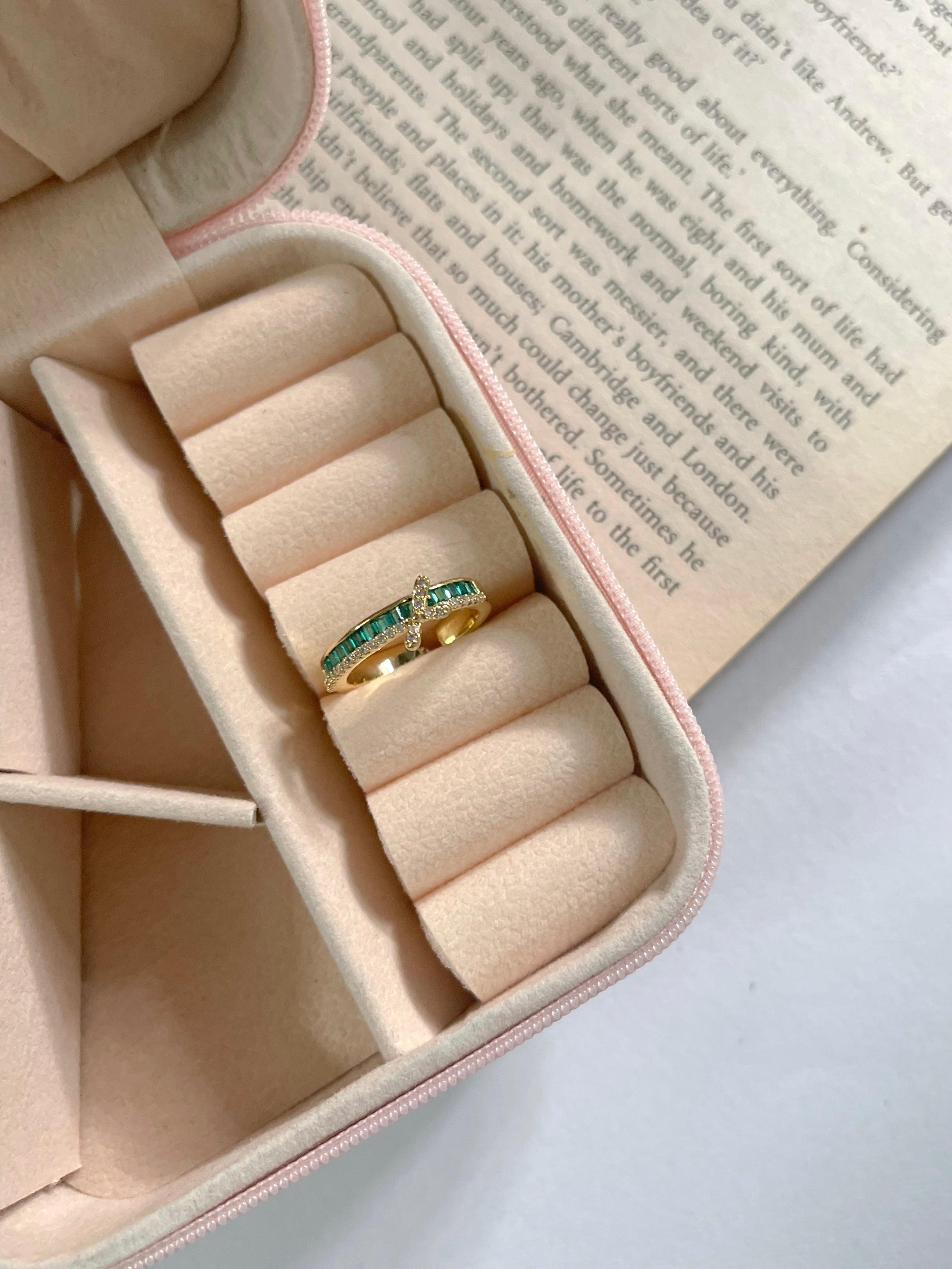 A perfect balance of brilliance and calm, one side gleaming with green stones in endless rhythm, the other grounded by a golden band kissed with light.