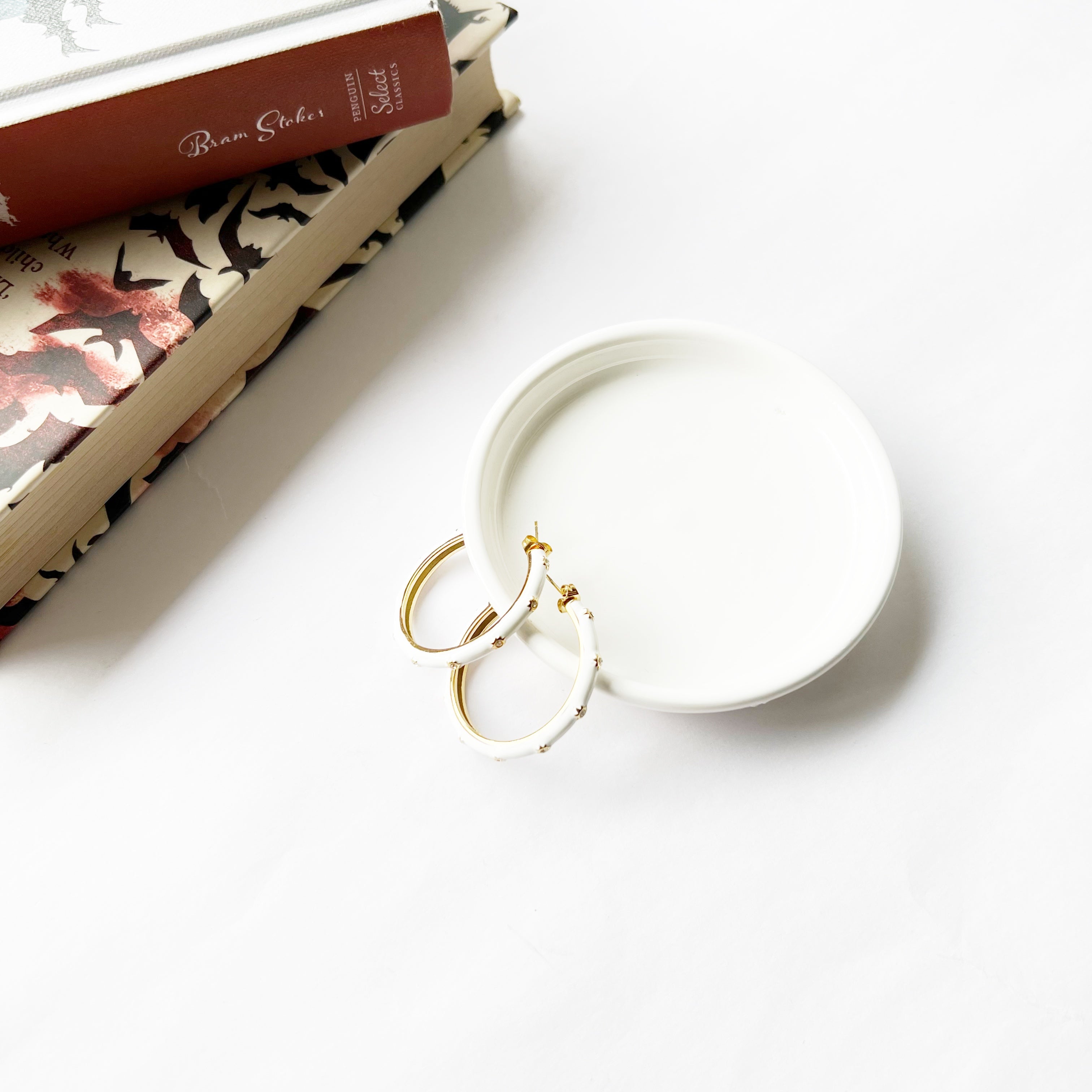 Elyse’s Halo is a heavenly accessory, featuring a delicate white and gold design. The subtle shine of the golden borders and etchings adds a touch of warmth to this elegant white hoop.