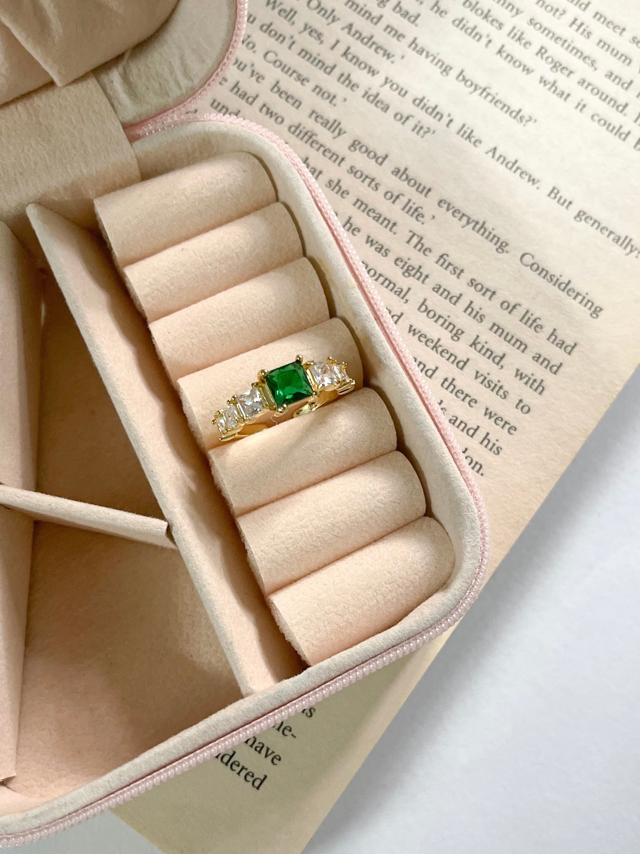 A masterpiece of symmetry and splendour, radiant crystal squares encircle the band, rising towards a magnificent emerald at the heart, elevated like a gem of destiny.