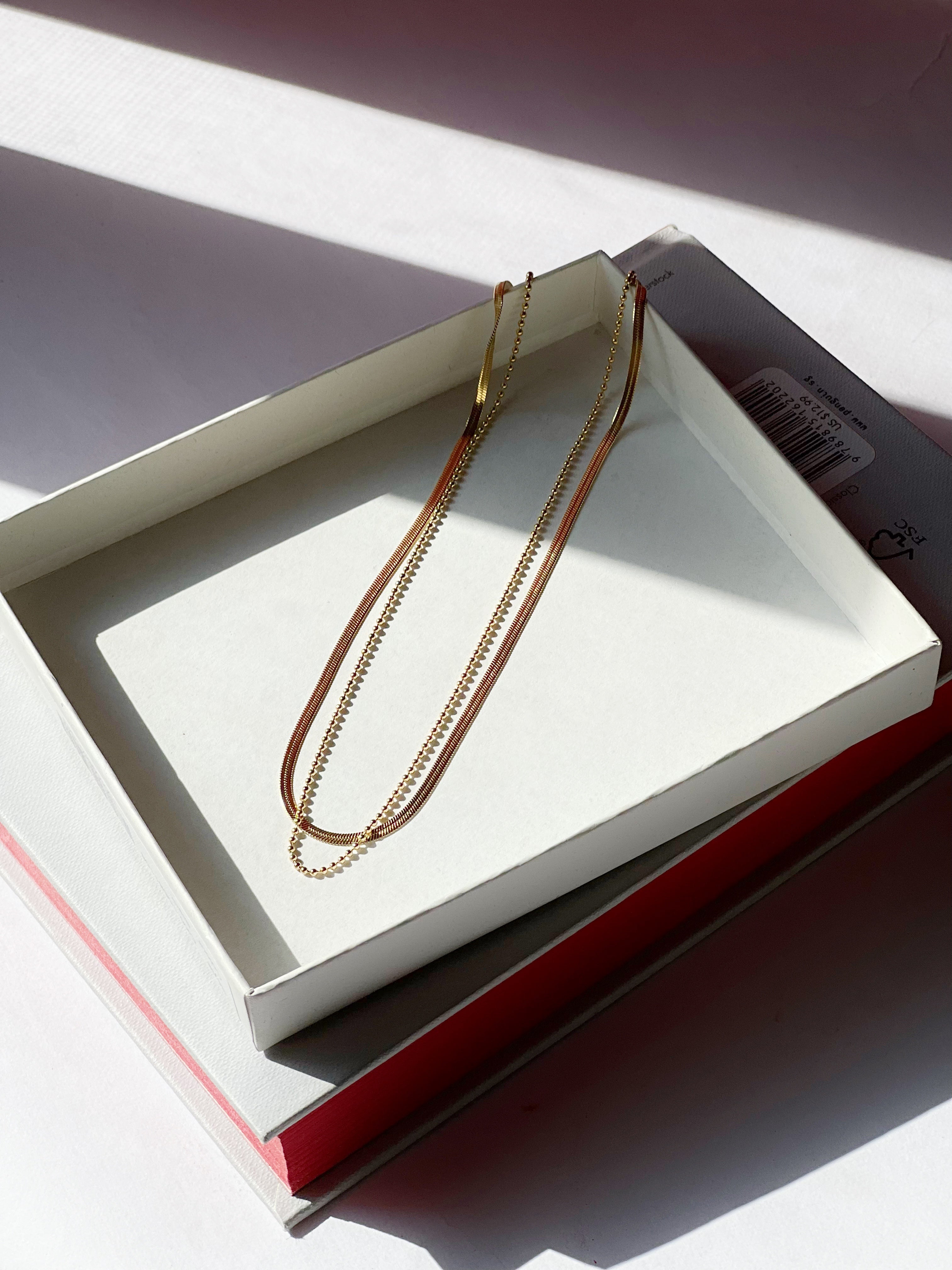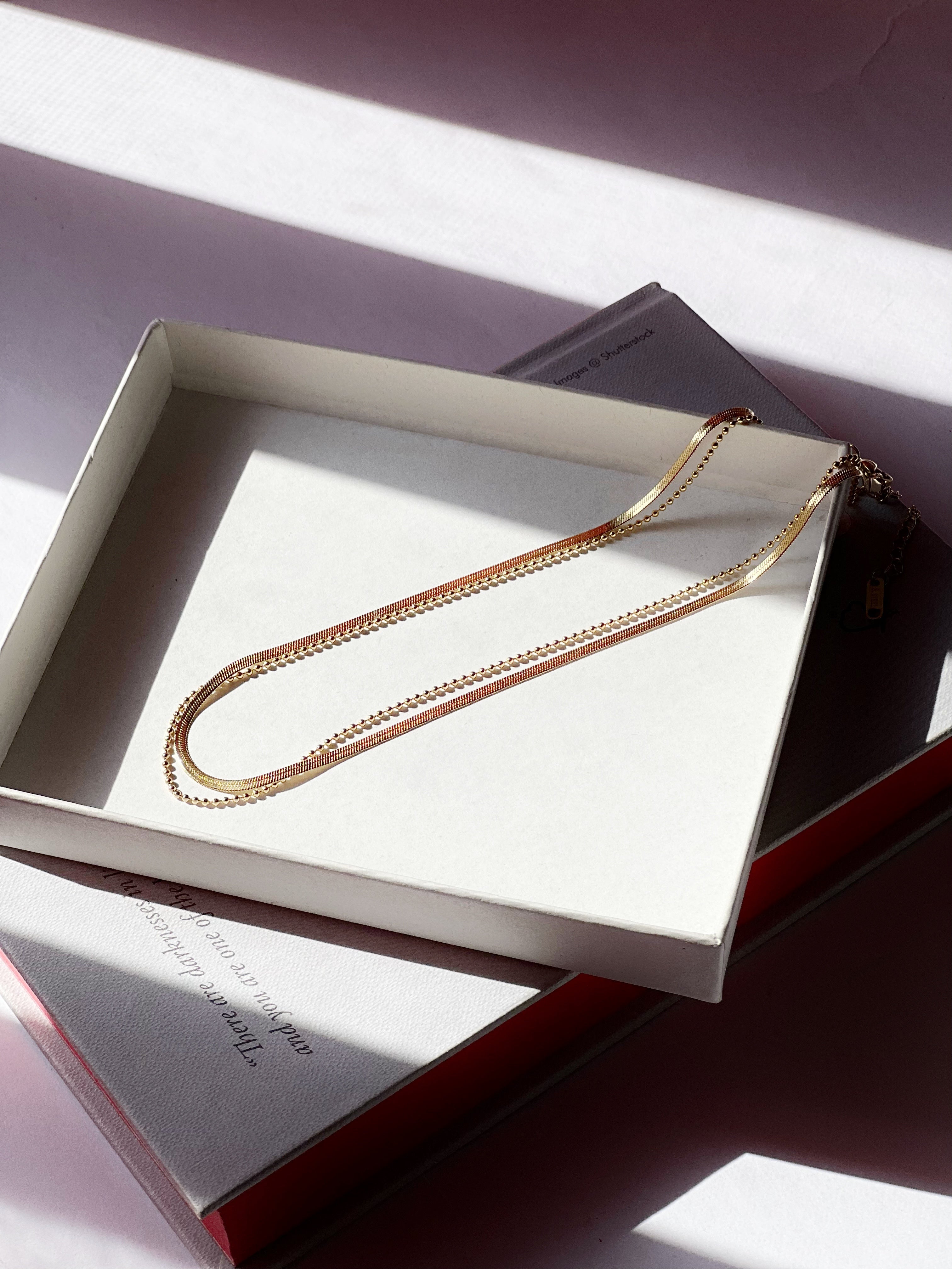 Indulge in the luxury of the Golden Reverie Chain, a double-layered masterpiece featuring a sleek snake chain intertwined with a delicate thin chain, creating a mesmerizing dance of gold.