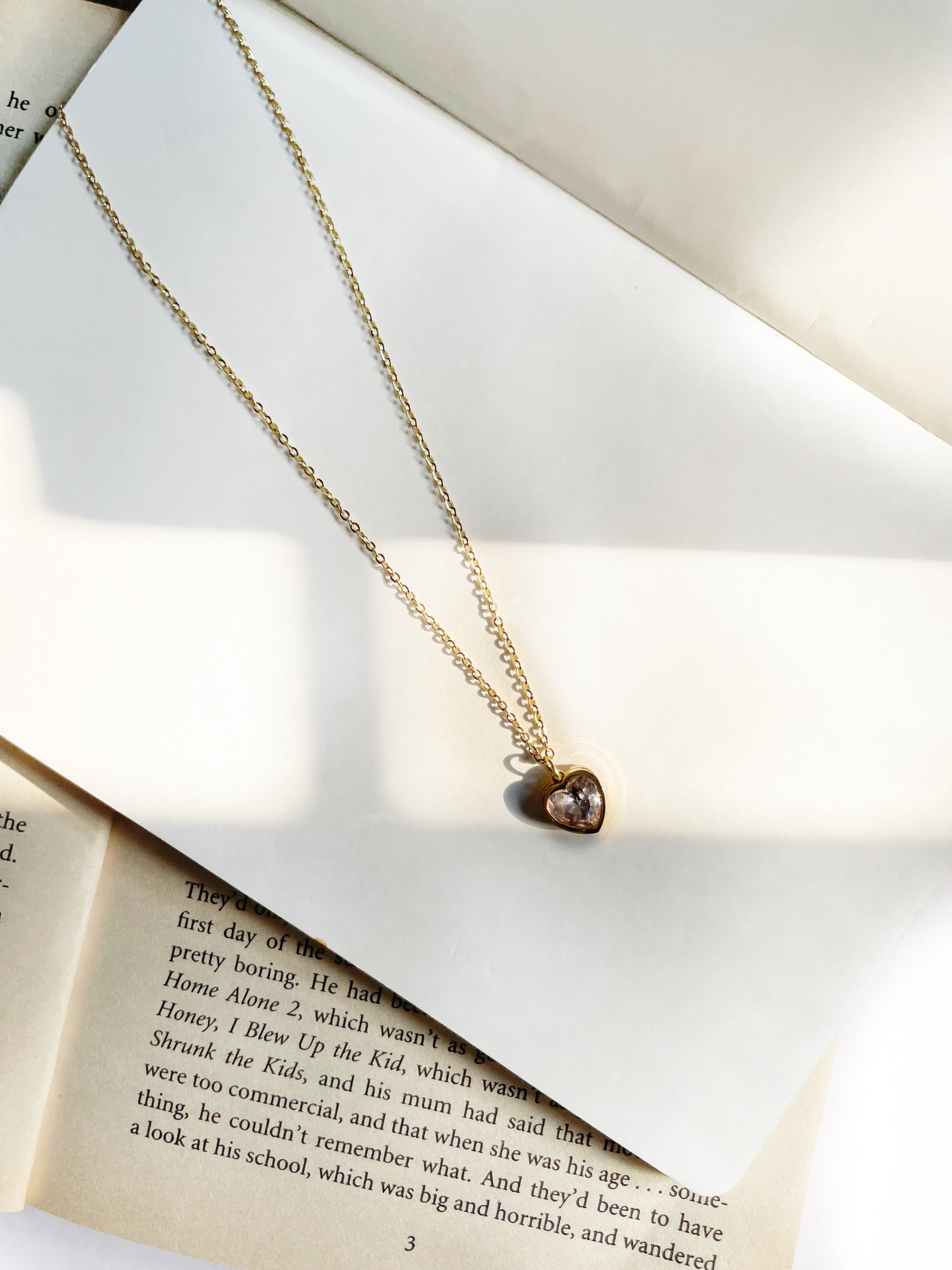 Discover the beauty of simplicity with our Golden Vista necklace, showcasing a heart-shaped locket with a pink stone on a delicate golden chain.