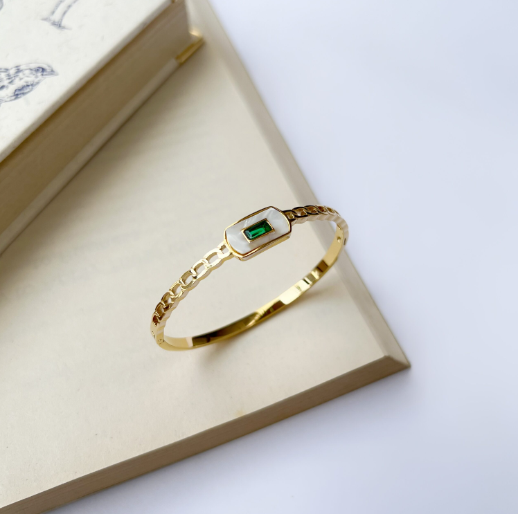 Wrap your wrist with Green Haven, a stunning cuff featuring a vibrant green center stone nestled in a crisp white frame.