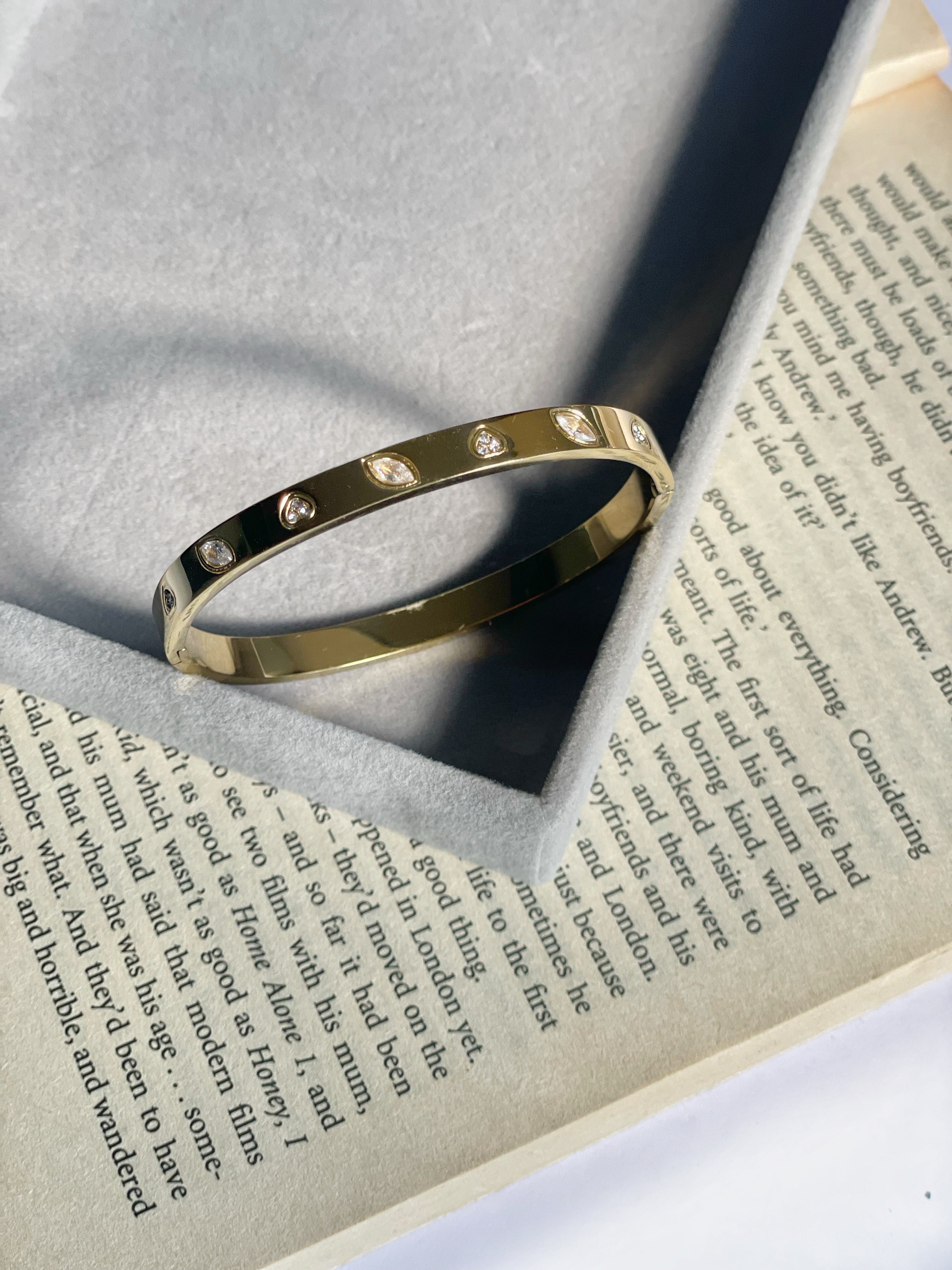 Our Heart & Vine cuff showcases a beautiful blend of heart-shaped and leaf-shaped stones, encrusted in a golden band that symbolizes love and growth.