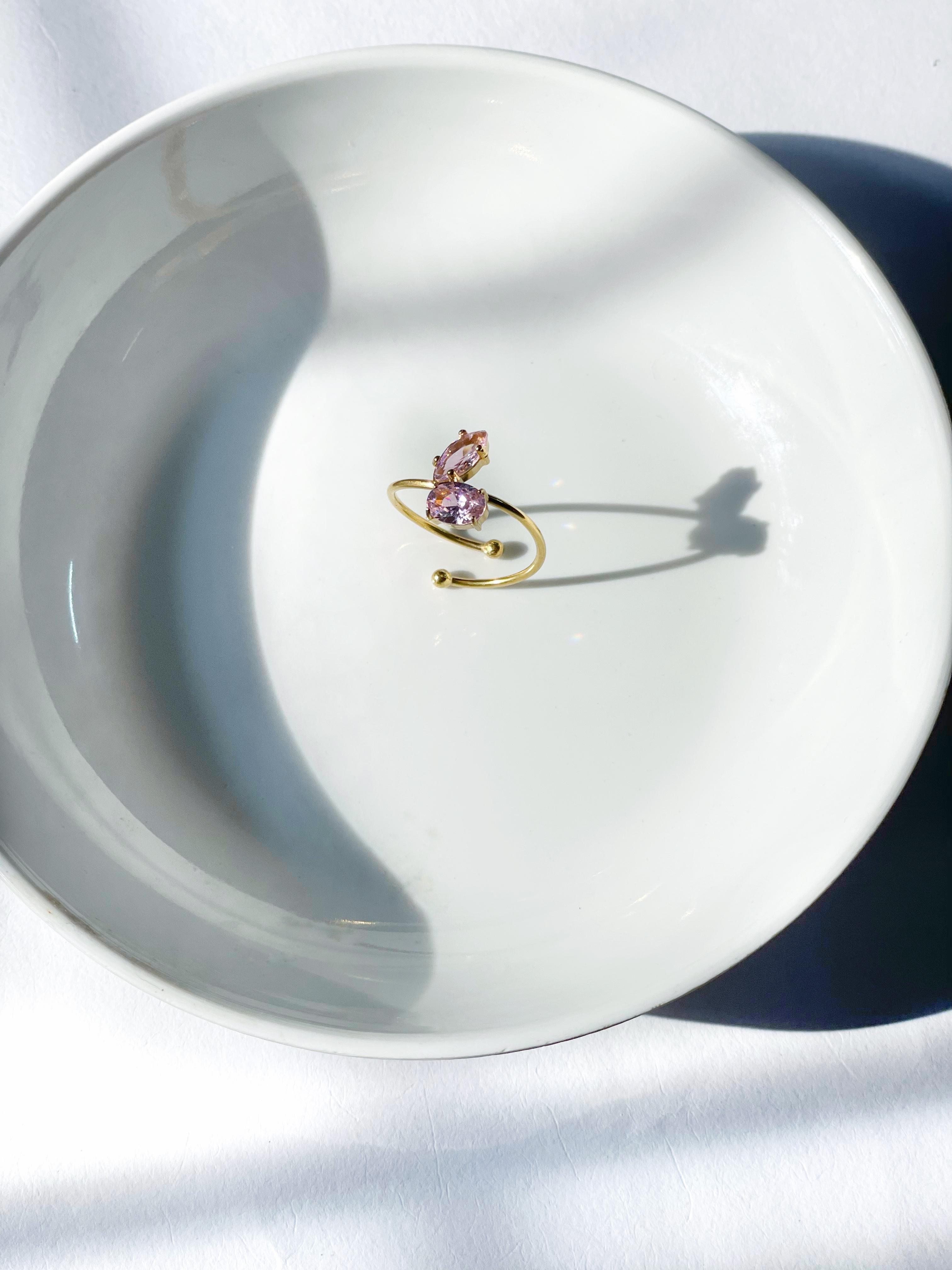 Delicate and dreamy, this slim gold ring features twin lavender stones that shimmer like a soft spring evening. A perfect kiss of lilac for your fingertips.
