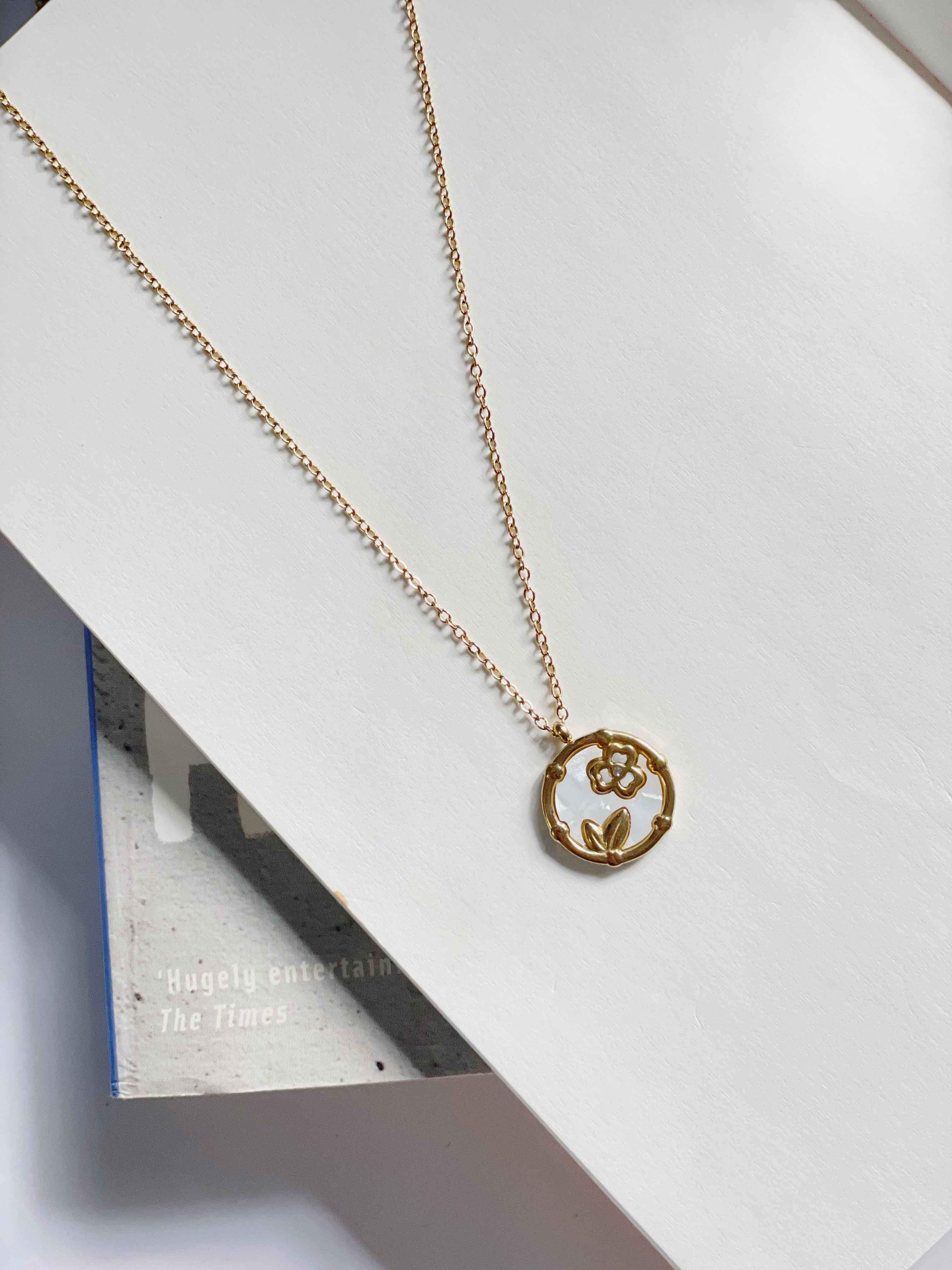 Adorn yourself with this stunning golden chain necklace featuring a beautifully crafted circular locket. The locket boasts a white center, framed in golden, and is adorned with intricate golden flower and leaf motifs.