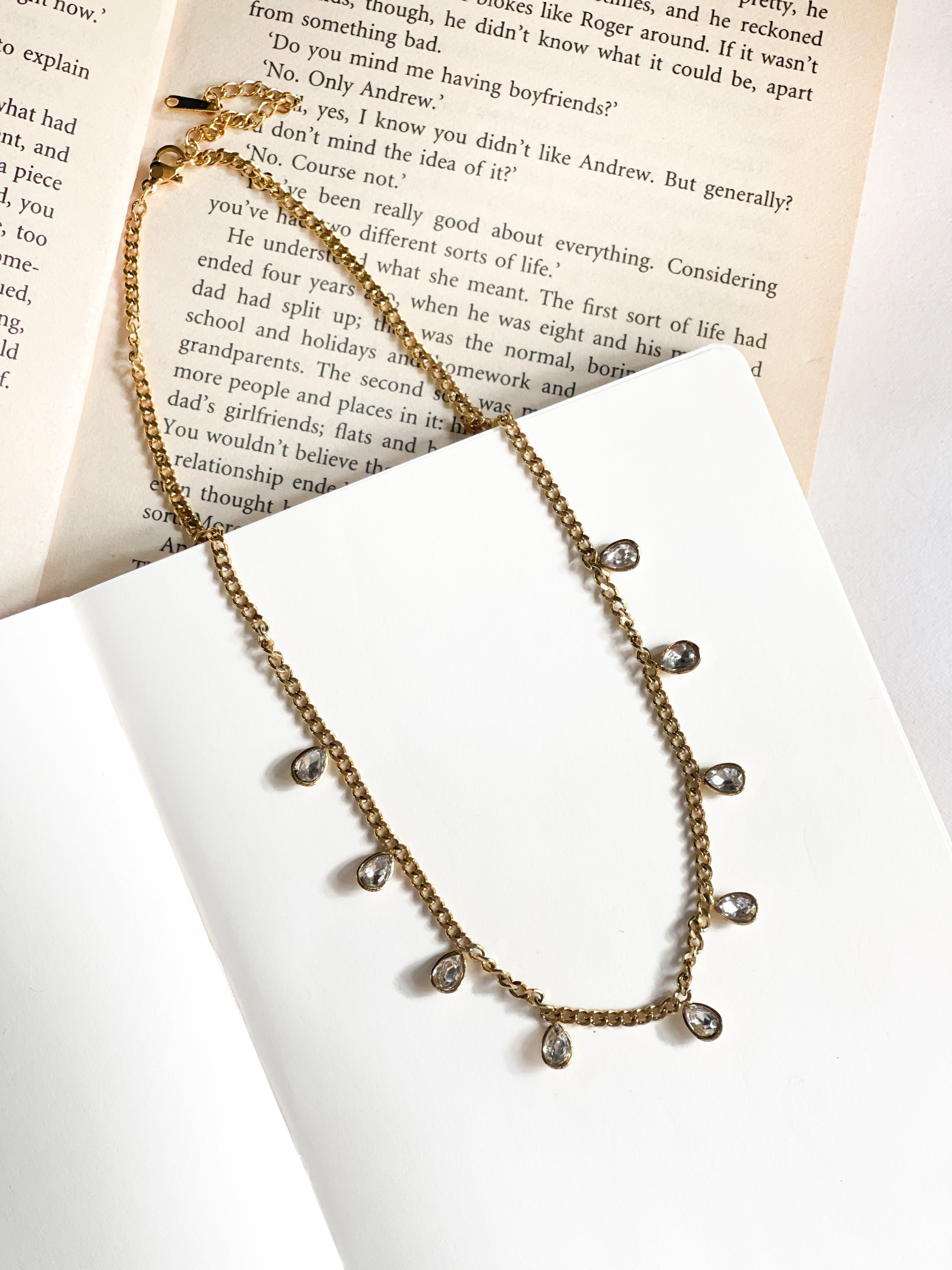 Liora Rain features delicate drops suspended from a linked chain, reminiscent of morning dew or gentle raindrops. Soft, sparkling, and exquisitely feminine.