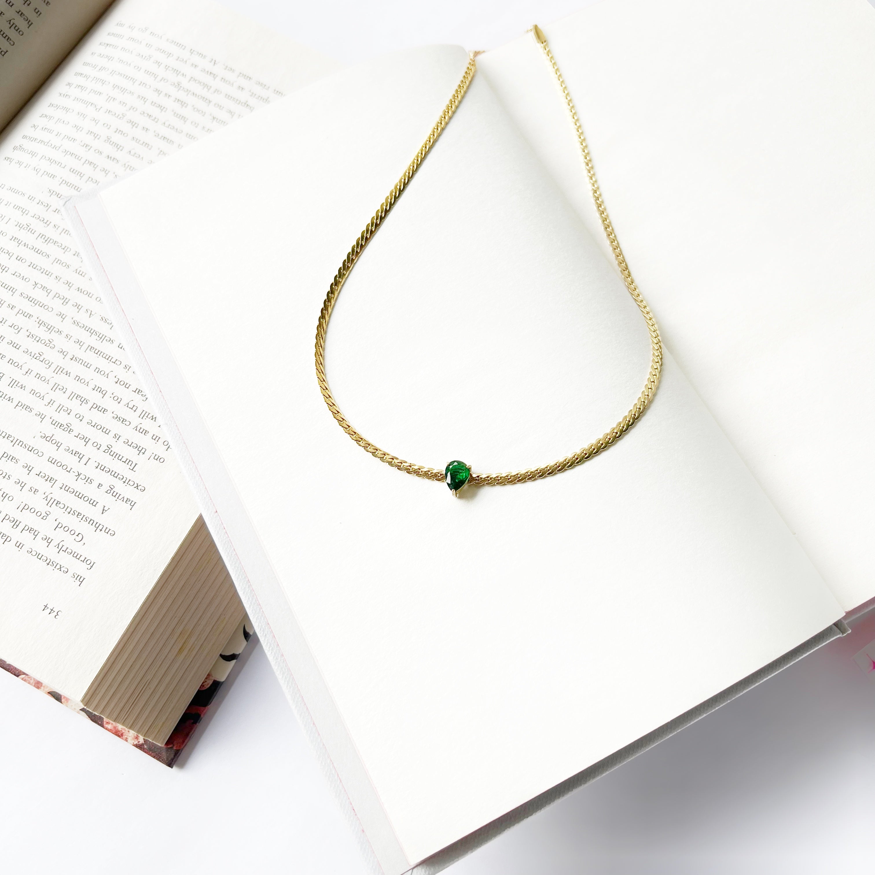 Meet Miss Oliviera, a golden charmer adorned with a mesmerizing green stone at its heart. This sleek chain’s smooth texture provides the perfect canvas for the stone’s unique allure, exuding understated elegance.