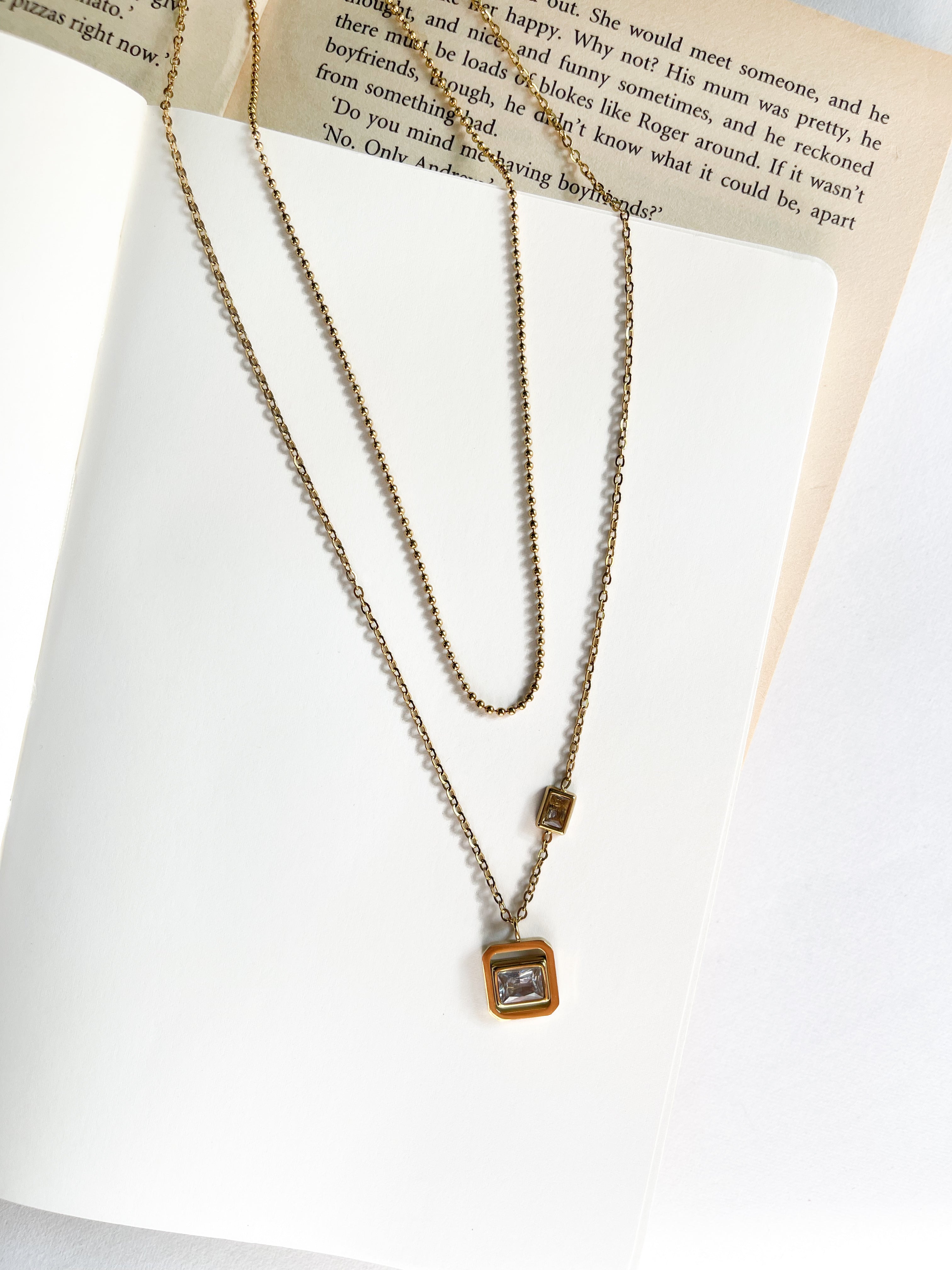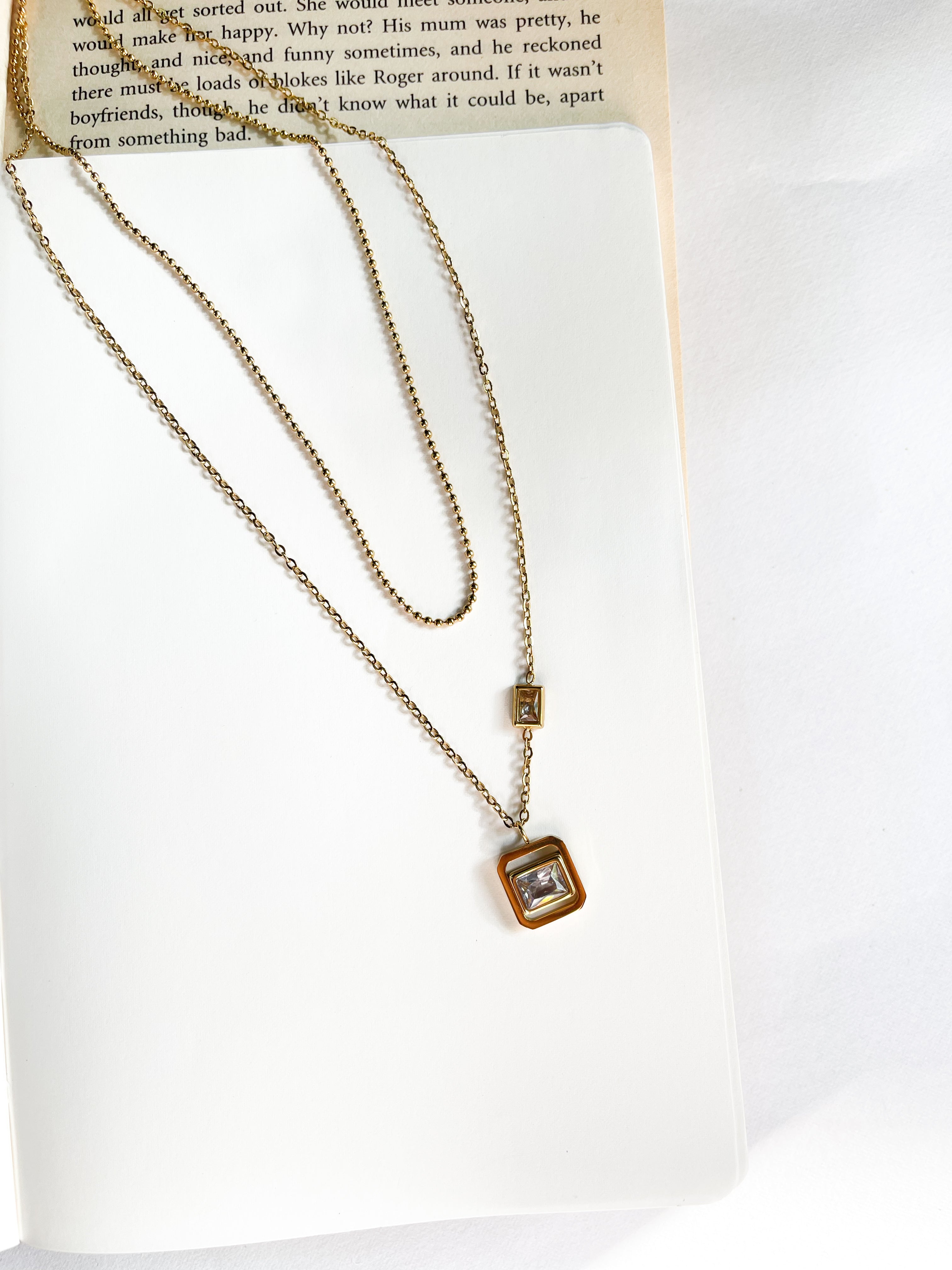 A striking square stone pendant hangs on layered chains in Solenne Square, balancing modern style with classic luxury. A necklace that’s simple, yet unforgettable.