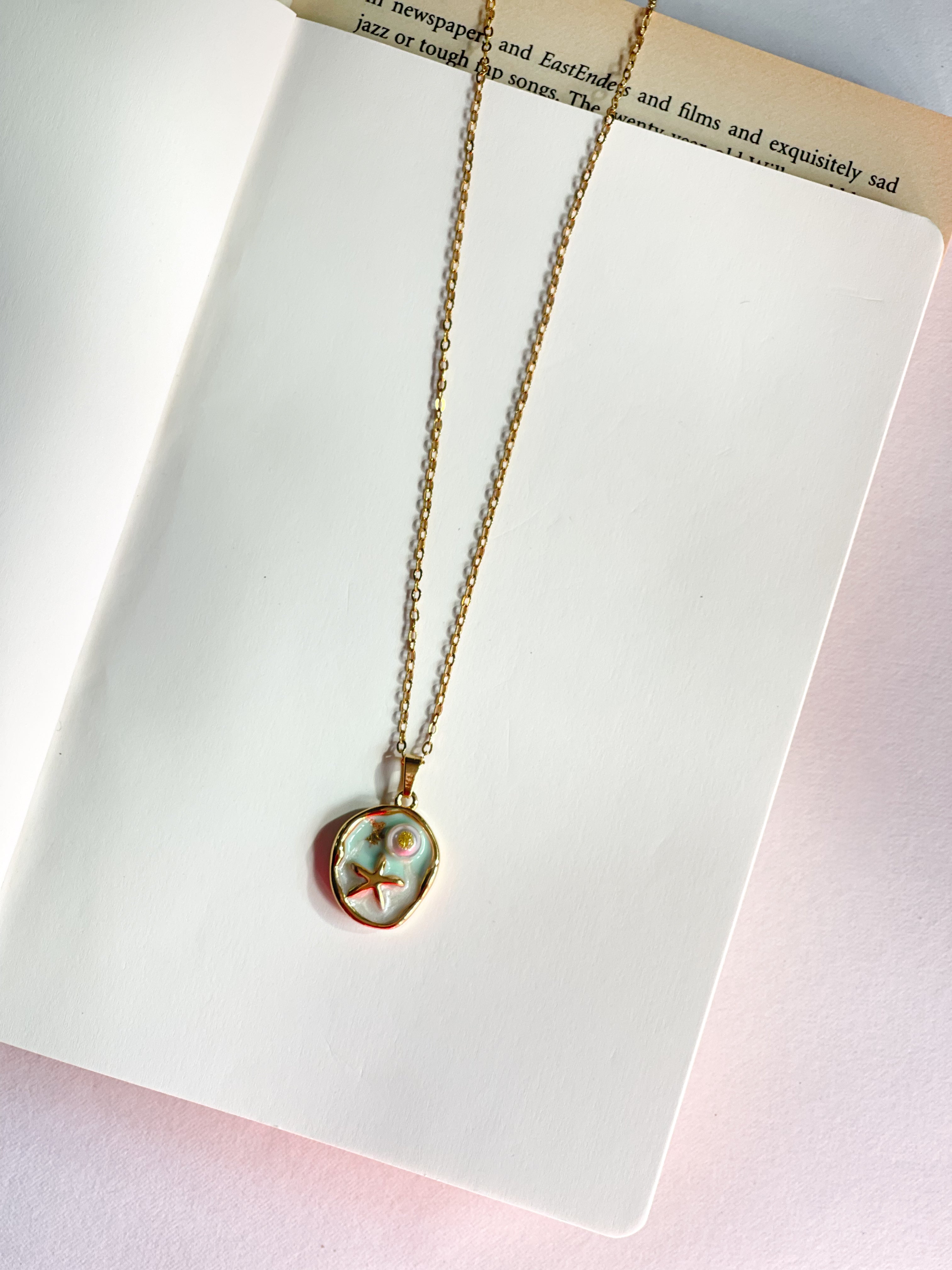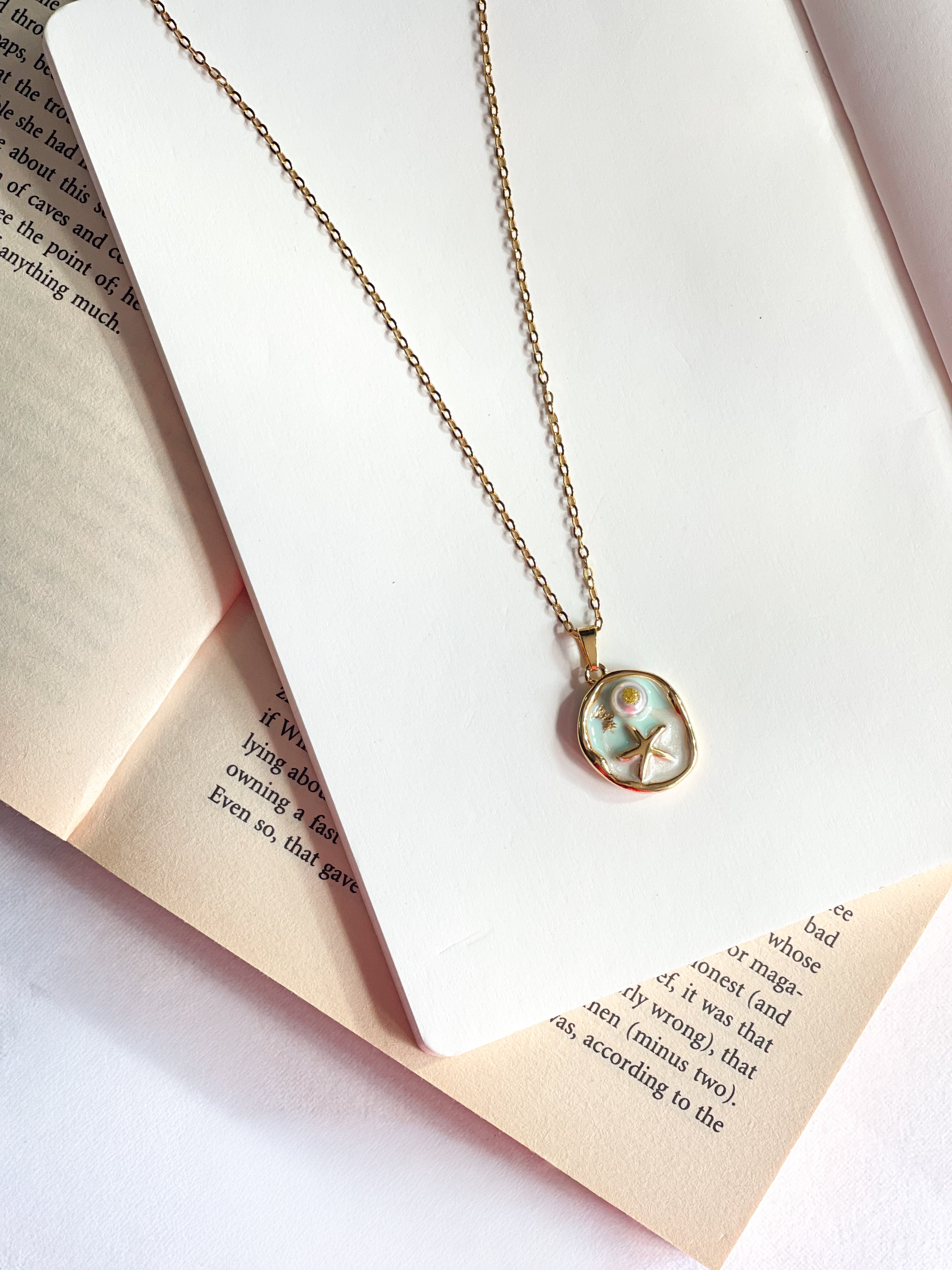 Bathed in celestial blues and soft whites, Star of Solara holds a golden starfish and pearl at its heart.