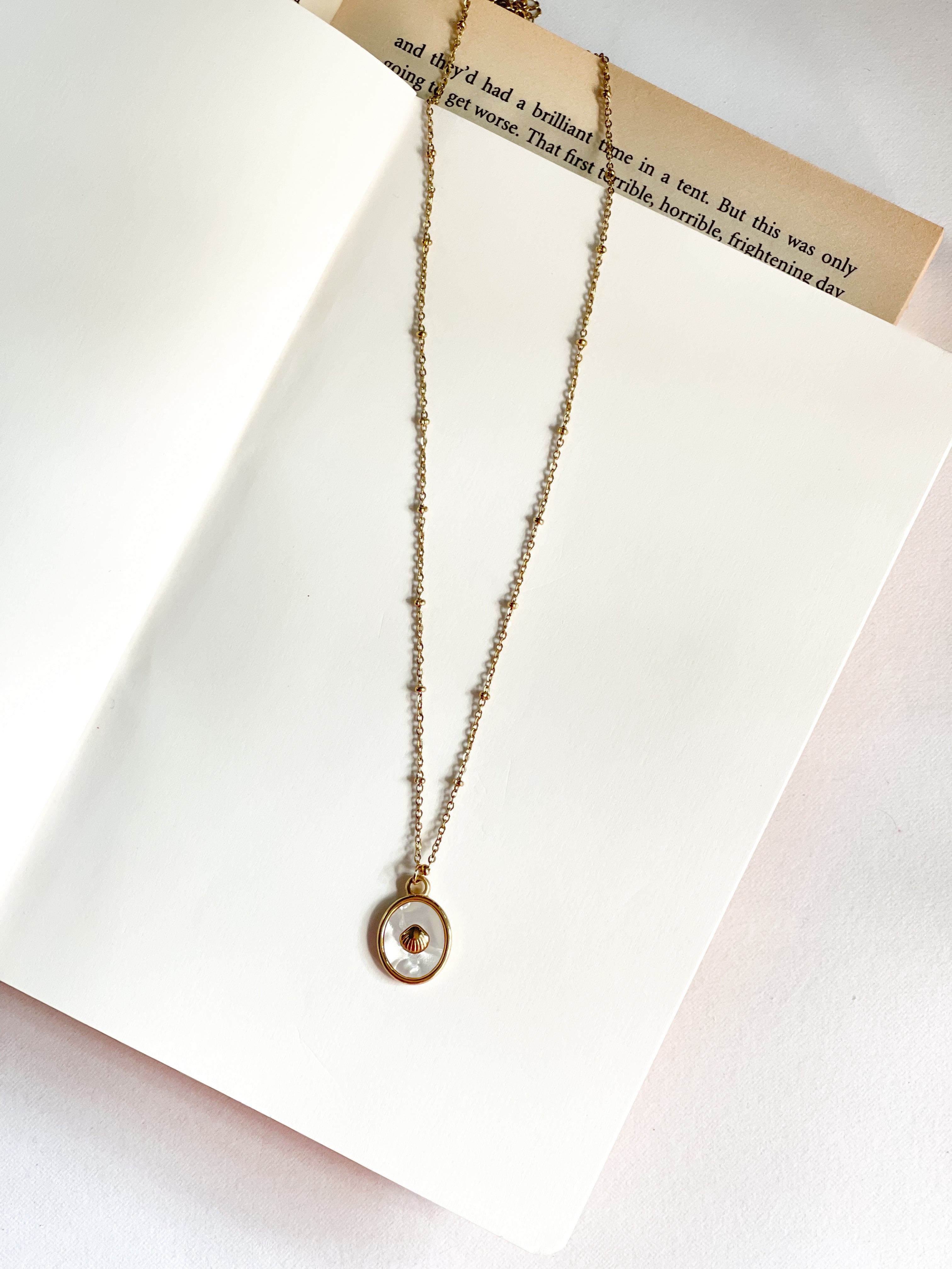 Mystical and refined, The Oracle Shell carries the allure of the sea’s secret gaze. The white, shell-like pendant crowned with a golden symbol evokes ancient elegance.