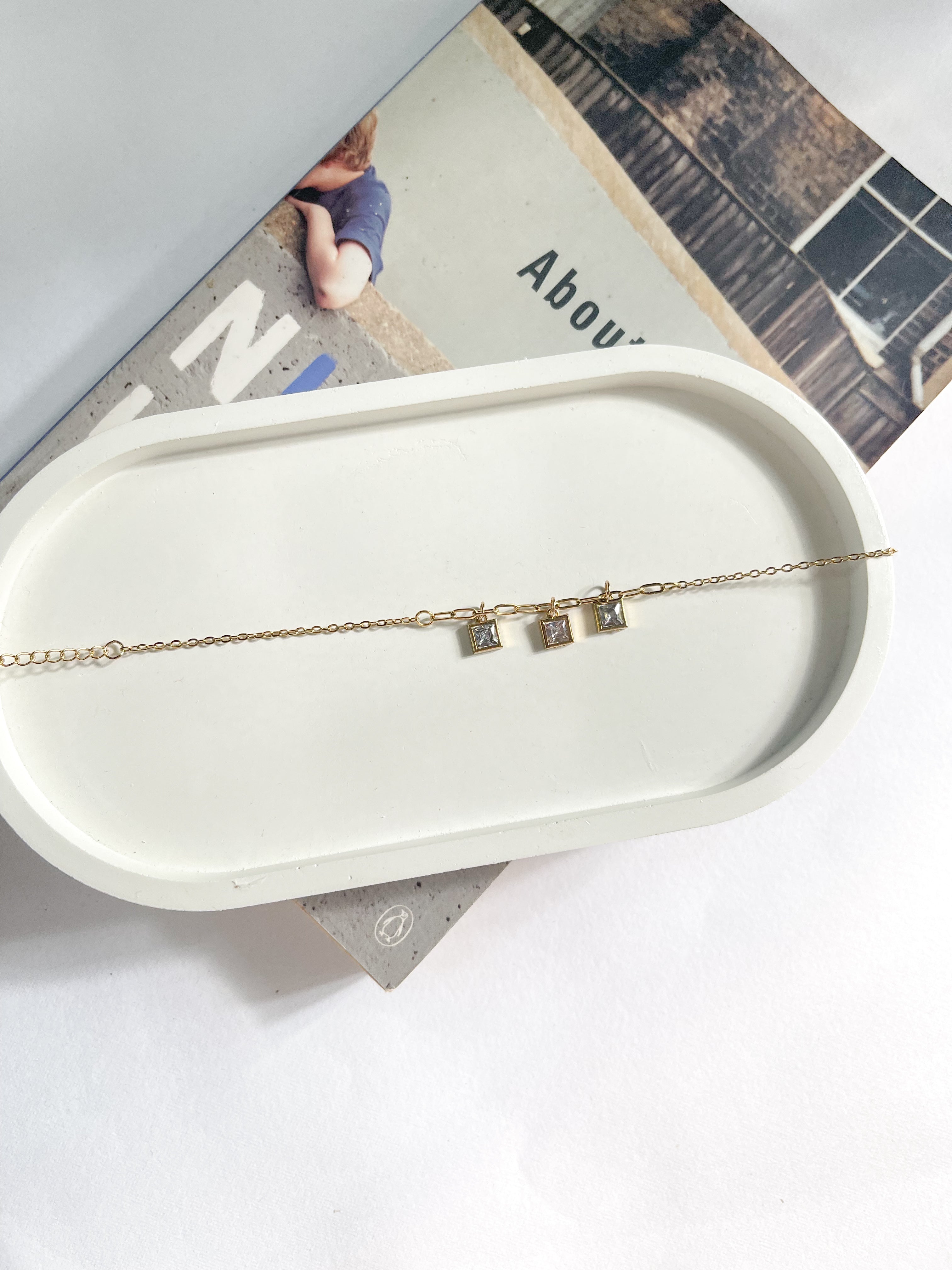 A thin golden bracelet that holds three square crystals in perfect symmetry.