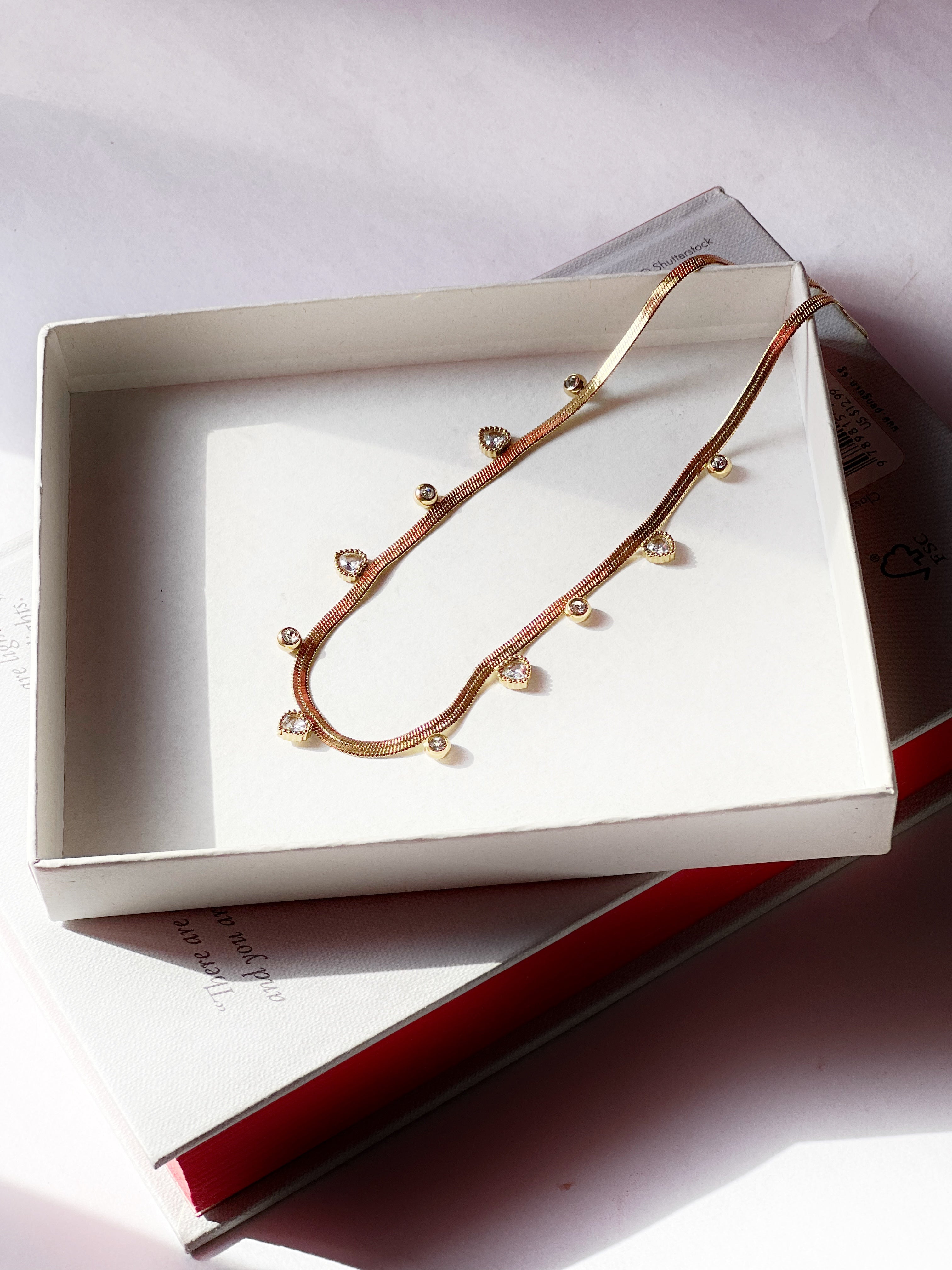 Twilight’s Kiss is a tender, dreamy design that will capture your heart, featuring a delicate golden snake chain adorned with an enchanting pattern of crystal stones in heart and round shapes, each one beautifully framed in gold.