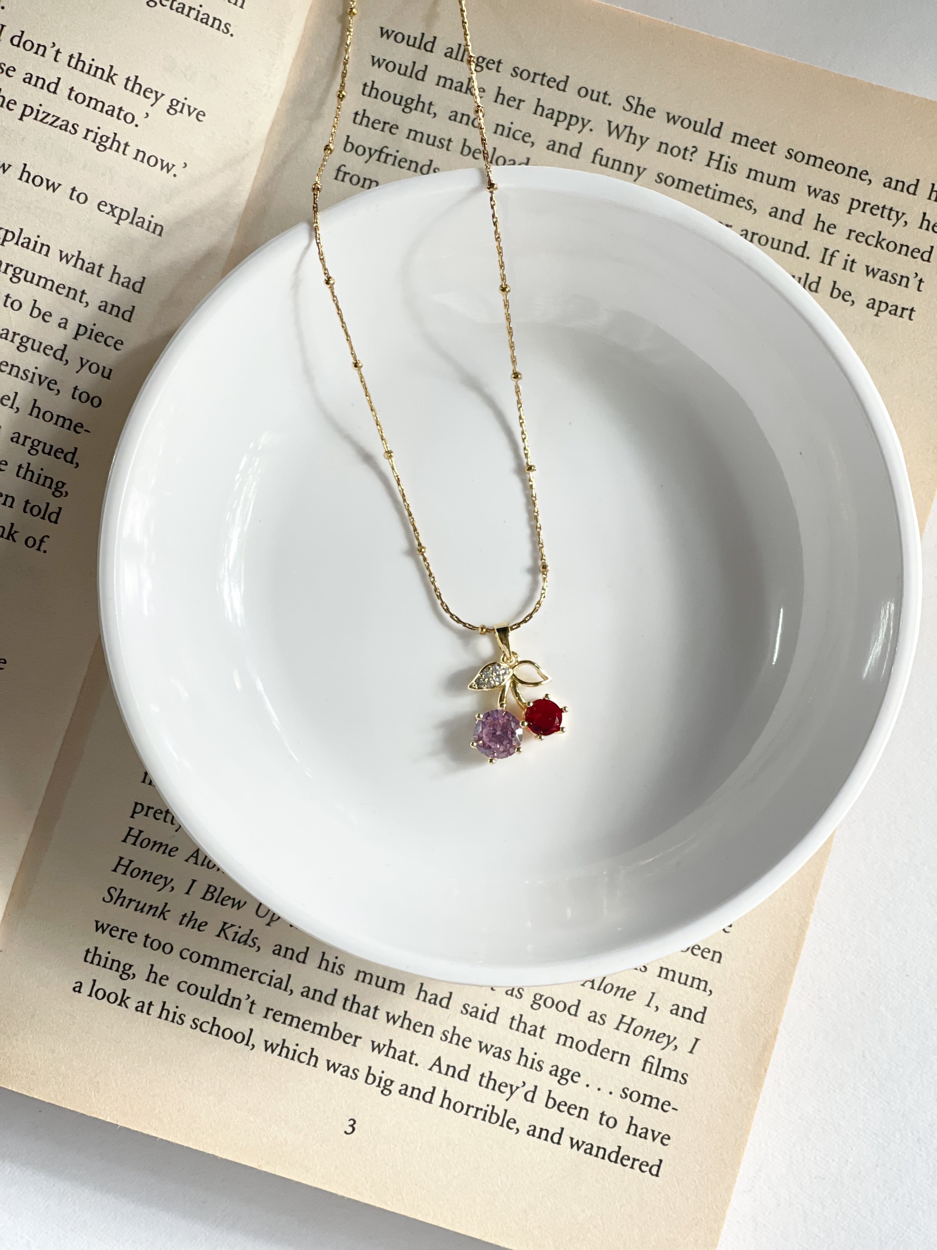 A melody of color and charm, the Cherry Duet Necklace captures two tones of sweetness, cherry red for passion, lavender for calm.