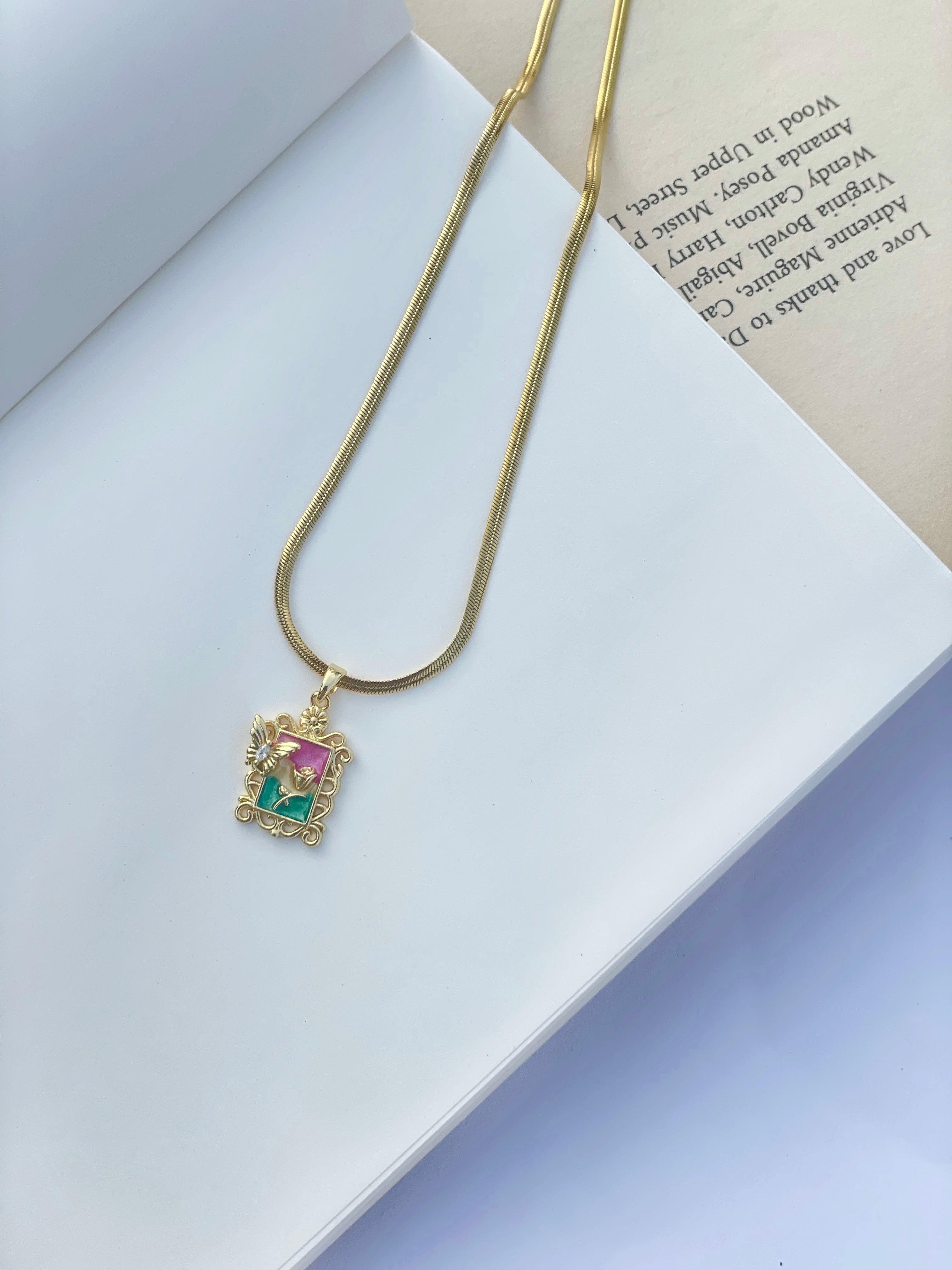 Valoria’s Portrait, a snake chain with miniature vintage frame that cradles a dreamlike portrait in soft pastels: blushing rose, sea-green, and hints of gold dancing around a delicate butterfly and blooming flower. Each detail is reminiscent of a hand-painted treasure, tenderly preserved in time.