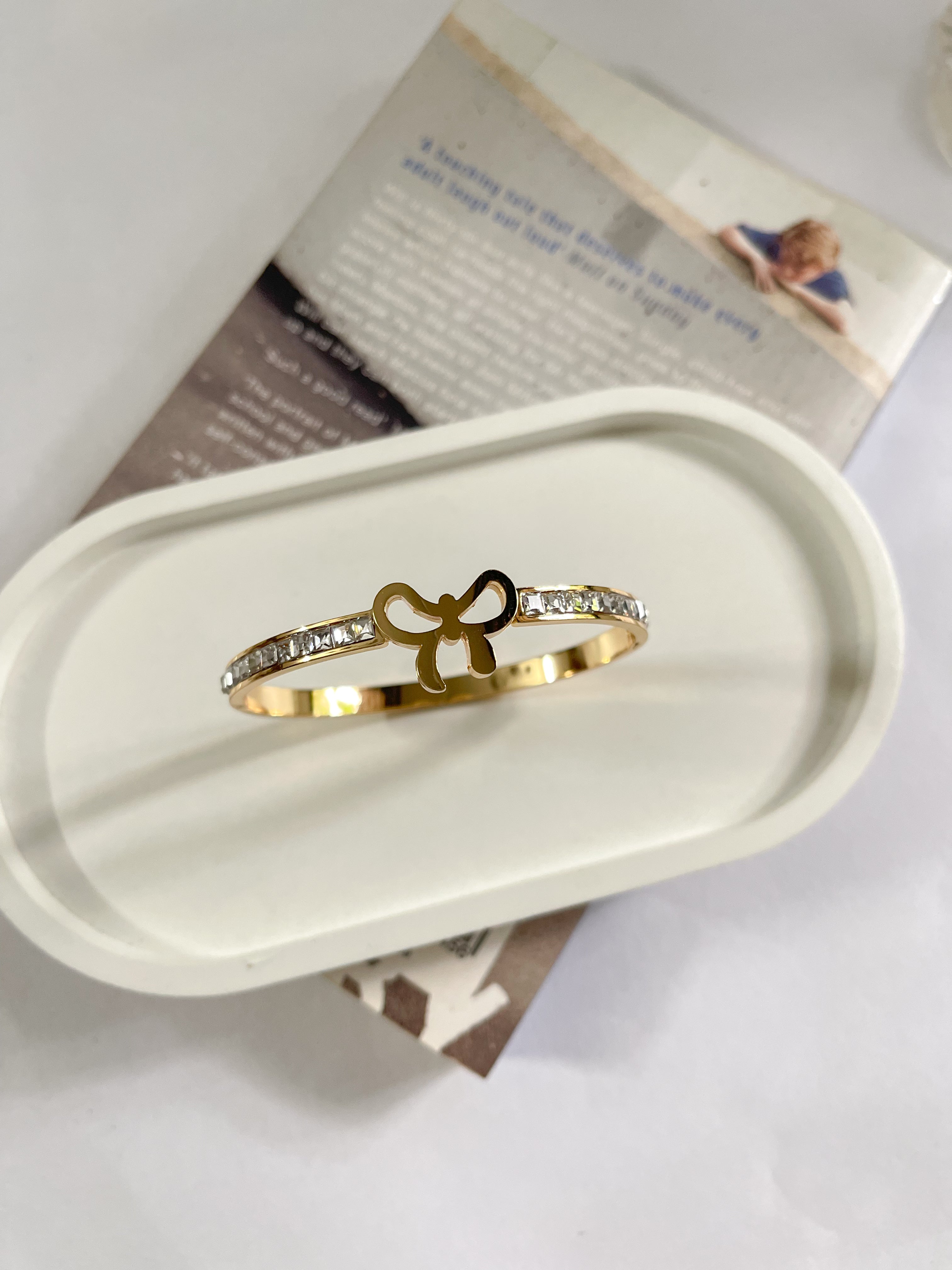 A radiant golden band encircles the wrist in light, crowned by a dazzling bow centerpiece.