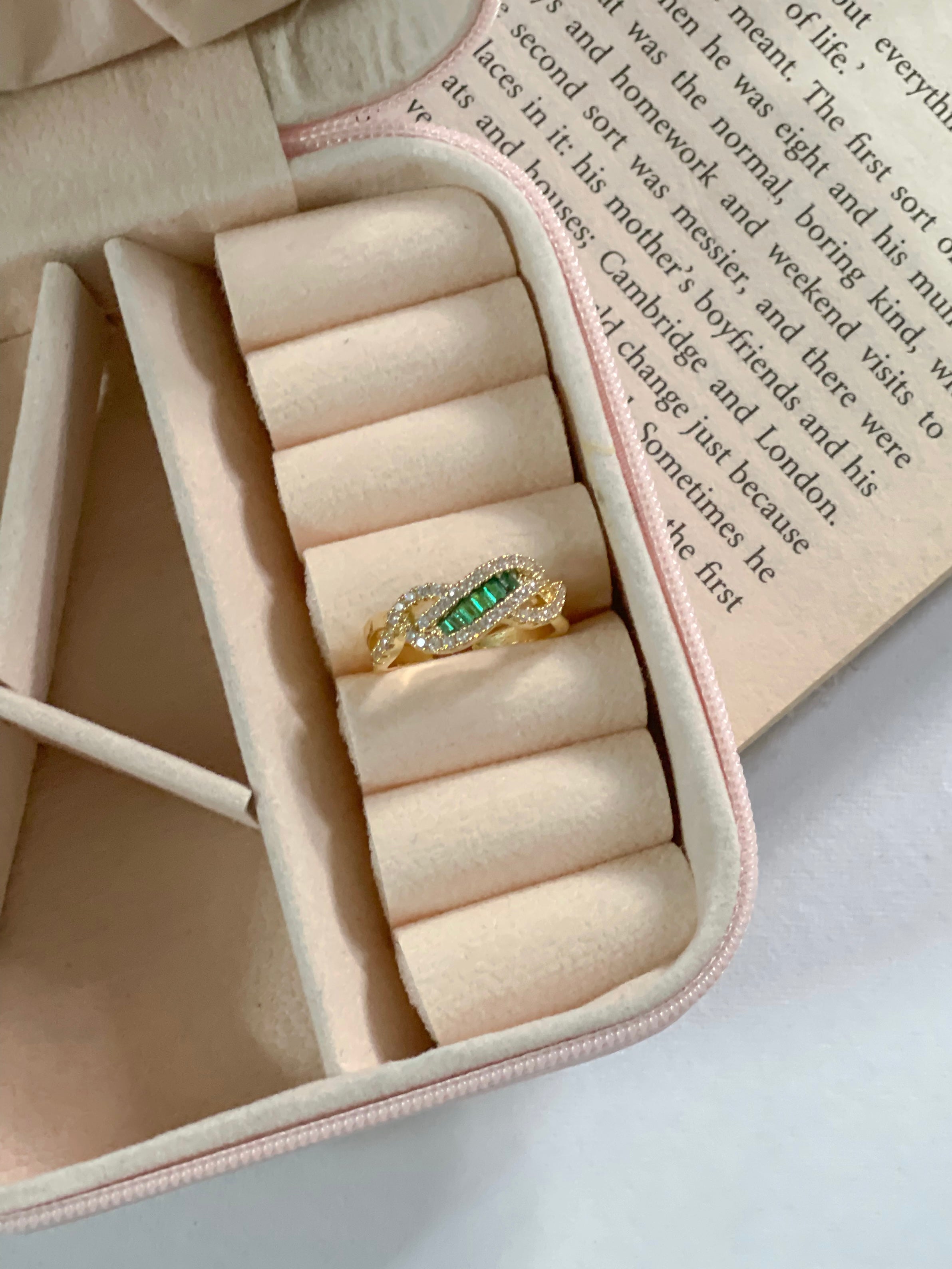 Bands twist and intertwine in a dazzling embrace, adorned with sparkling stones. Between the elegant curves, a small array of green gems anchors the design, offering a vivid focal point.