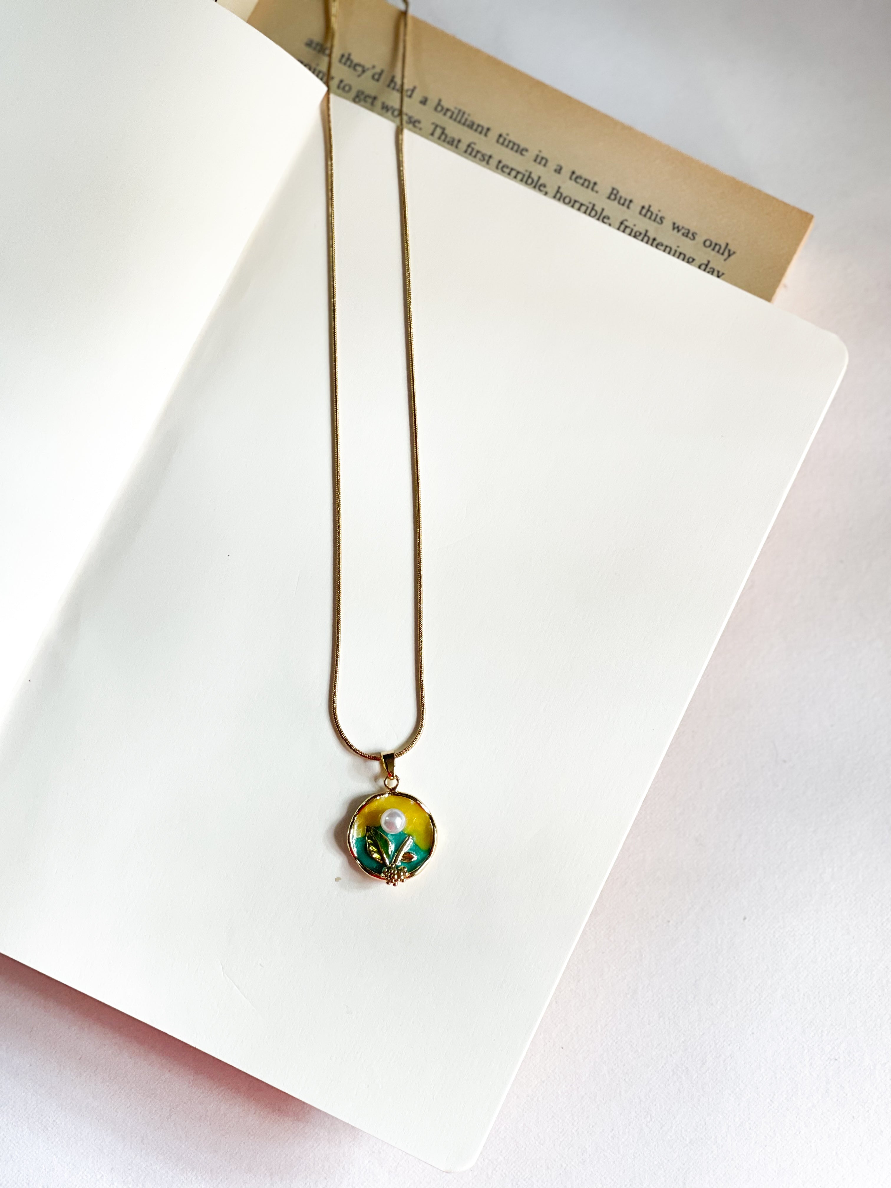 Where art meets nature, Verdelle Grace pairs vintage hues of green and gold with a delicate golden leaf and a single white pearl.