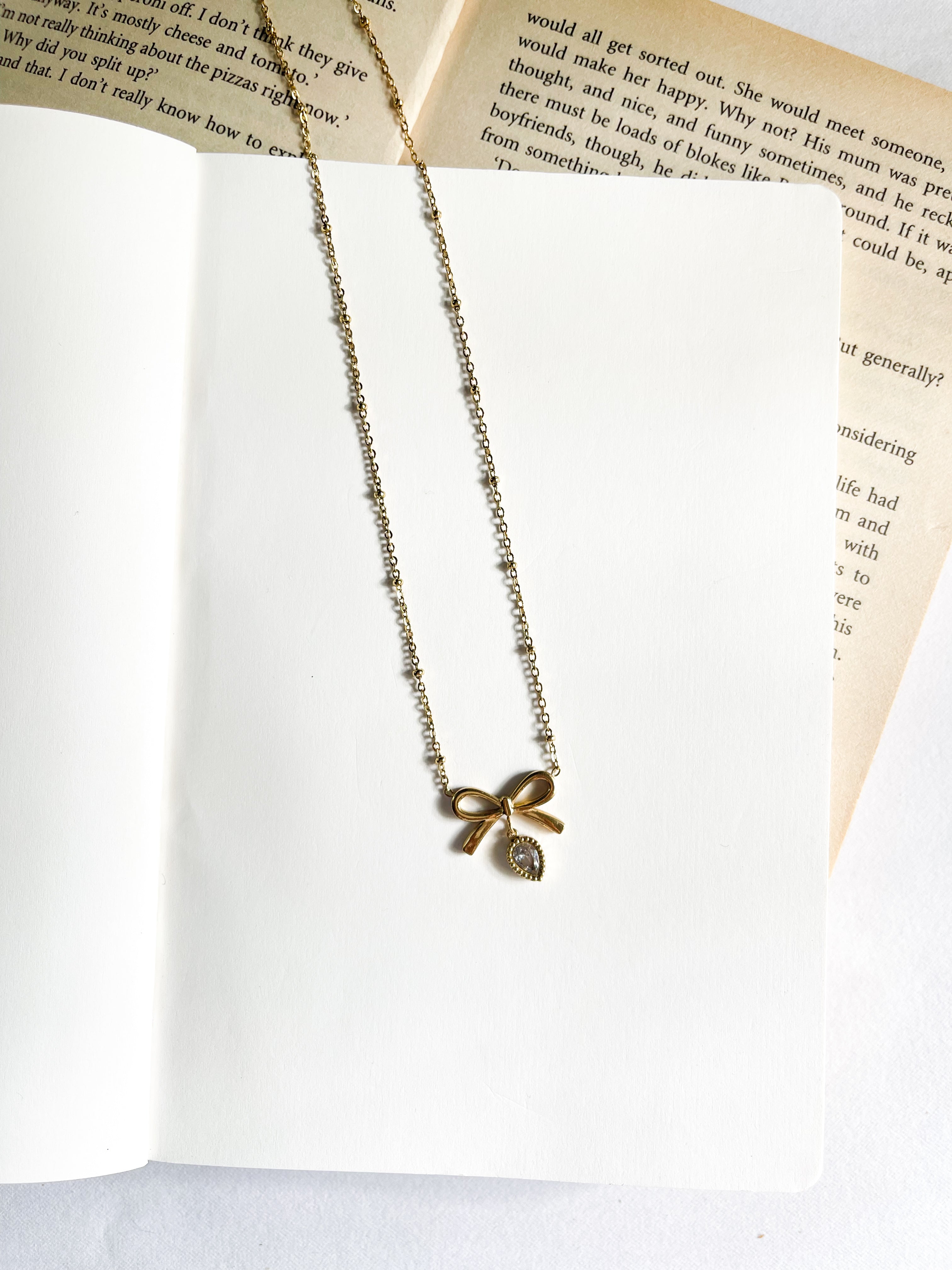 Whispered Ties features a ribbon-shaped pendant with a luminous drop. Soft, sophisticated, and endlessly elegant, it speaks of bonds held close.