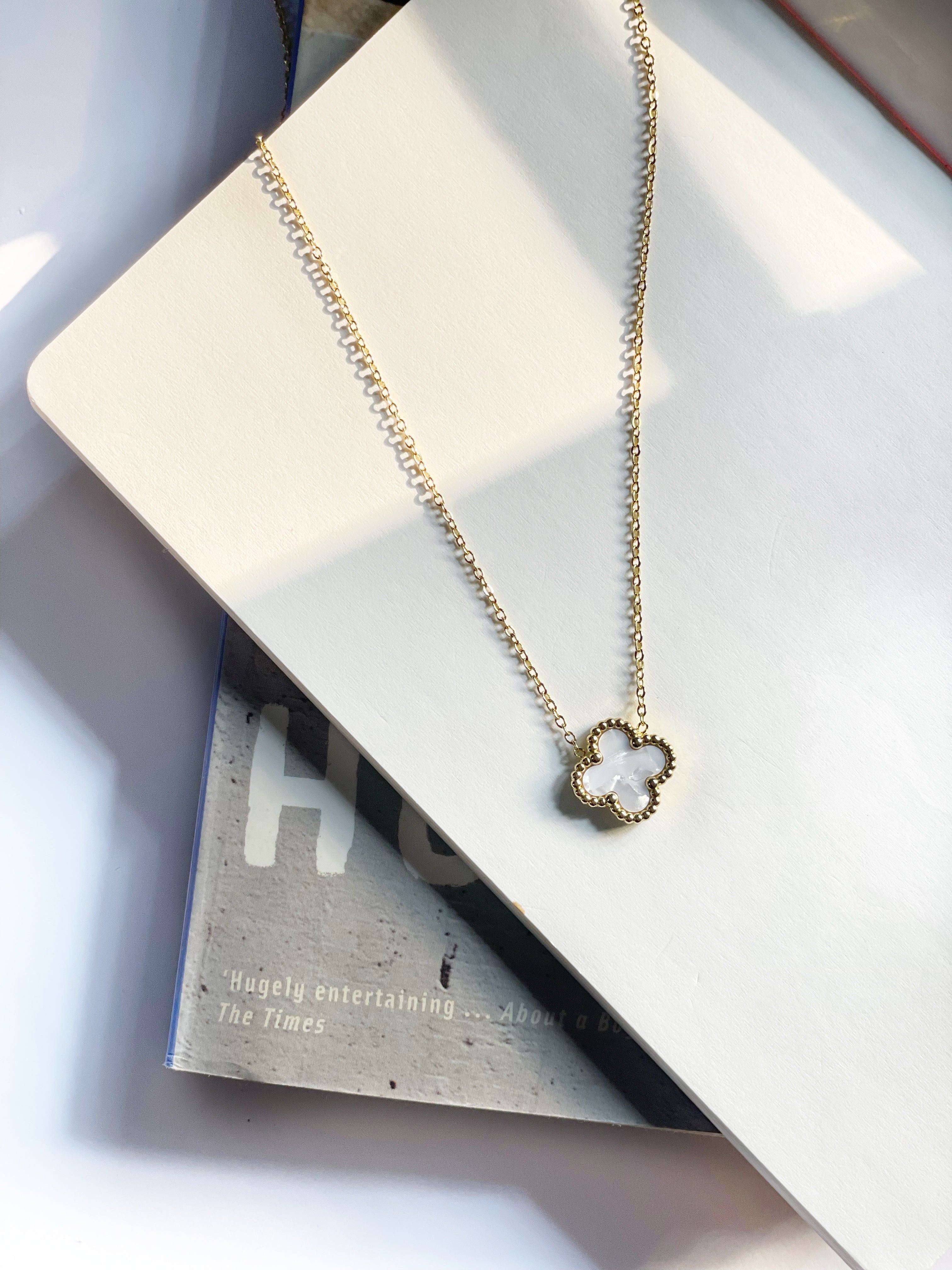 Add a touch of whimsy and charm to your everyday look with our delicate white clover pendant, a symbol of good fortune and innocence, suspended from a dainty chain.